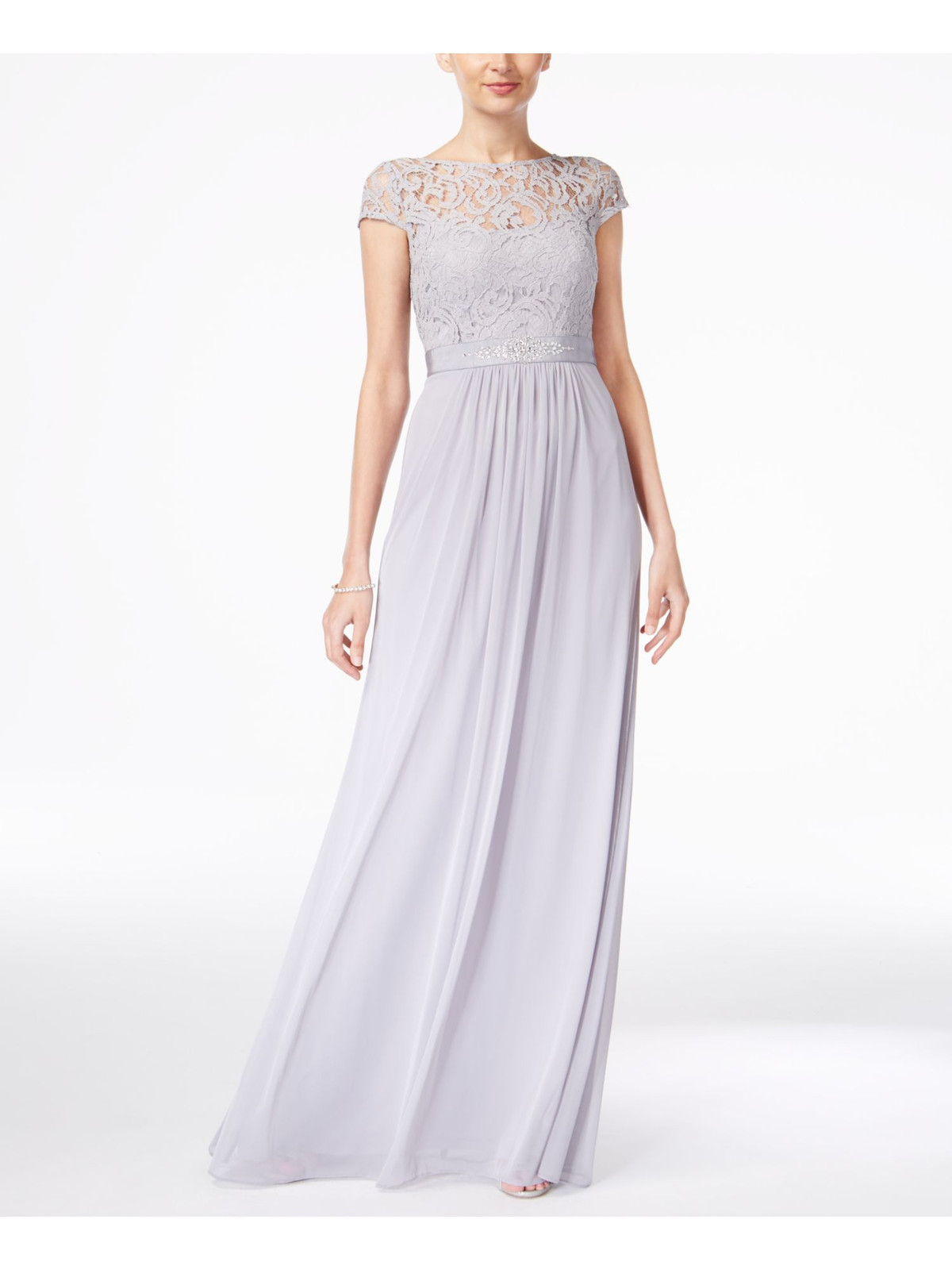 This stunning silver dress is absolutely gorgeous—the illusion neckline and empire waist give it such an elegant, flattering fit! Despite the minor snag (barely noticeable), it looks and feels luxurious, perfect for special occasions. The fabric drapes beautifully, and the short sleeves add a touch of sophistication. Spot-clean only, but totally worth it for such a gorgeous piece at a fraction of the original price! A must-have for any formal event!
