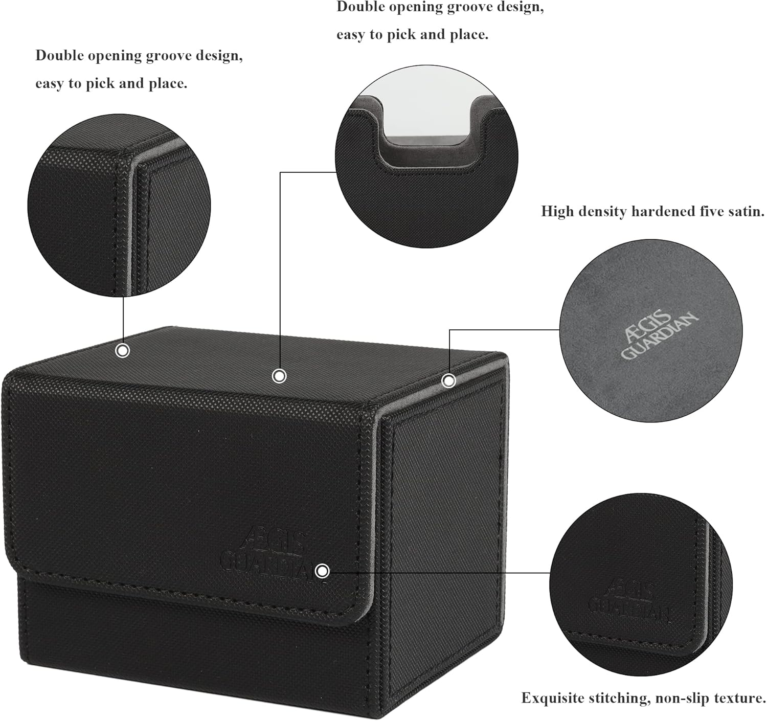 Leather Capacity - Commander deck box can hold 100+ double-sleeved cards, 150+ single- sleeved cards, 200 + unsleeved cards, Due to the thickness of sleeves, the actual number of cards that can be holded varies. Exquisite Workmanship - The card deck box for MTG outer skin is made of mesh pattern, which is non-slip and wear-resistant; each edge is precisely sewn, the margins are symmetrical, uniform and meticulous; the entire chess and card storage box is neatly connected and seamlessly connected. Powerful Magnet - Tight Stitching 4 magnets keep the card holder secure during transportation. Even when fully loaded and turned upside down, the card deck case stays shut tight. Groove Design - The commander deck box is designed with grooves on the front and back sides, which is convenient for picking and placing. Versatile - Our mtg deck box is designed to fit a variety of cards. Compatible with magic the gathering, yugioh! Product Description ÆGIS GUARDIAN DECK BOX Made for gamers super large capacity convenient card deck box Features Strong Magnetic Closure Two high-strength magnets keep the card holder secure during transportation. Even when fully loaded and turned upside down, the deck box stays shut tight. Groove design, easy to pick and place. Double layer reinforcement, exquisite workmanship Three-dimensional paste, high fit. Neat docking, seamless link.