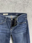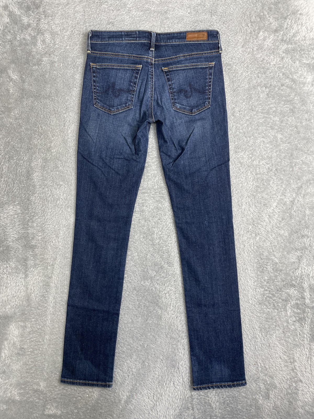 Pre-owned AG Adriano Goldschmied women's The Stevie slim straight jeans in a medium wash blue stretch denim. Brand: AG Adriano Goldschmied Style: The Stevie Slim Straight mid rise jeans with a slim fit through the hip and thigh and straight leg silhouette. Department: Women Color: Medium blue wash with subtle fading and whiskering; Pattern: Solid, non-distressed denim. Tag size: 26R (Women's) Material: 70% cotton, 28% lyocell, 2% polyurethane stretch denim (per care tag). Closure: Zip fly with metal logo button at the waist and belt loops around the waistband. Details: Classic five-pocket styling with front scoop pockets and coin pocket, back patch pockets with AG embroidered wave detail, slim straight leg, contrast stitching, finished hems, and comfortable stretch suitable for everyday wear. Branding: Leather AG Adriano Goldschmied logo patch at back waistband, AG-branded shank button and rivets, interior AG woven waist label, and The Stevie style label. Interior label information: Care tag lists fabric content 70% cotton/28% lyocell/2% polyurethane, style code PVC 1289-MTE, PO# AG-23362, made in U.S.A. of imported fabric, with machine wash cold and tumble dry low instructions. Classic made in USA AG The Stevie slim straight jeans offering a versatile medium wash denim look for year-round casual outfits.