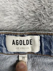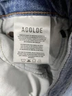 Brand: AGOLDE Style: Harper high rise straight leg jeans in a medium wash blue denim with subtle fading. Department: Womens; Size on tag: 28; regular fit high rise silhouette. Material: 86% cotton, 11% post consumer recycle cotton, 3% elastane; soft stretch denim fabric. Made in Turkey of imported materials. Details: Five-pocket design, zip fly with button closure, belt loops, straight leg, raw/frayed hems, classic plain back pockets, AGOLDE logo label at inner waistband. Approximate inseam: 29.5 inches. Style/Model information: Style# A9153-1554 Harper; Cut# 69822; RN# 109670.