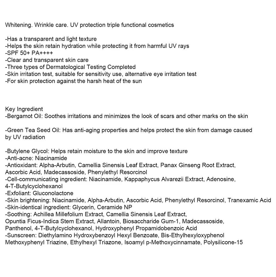 AHC Safe On Light Sun Serum 40mL + Sun Serum 20mL SPF50+, PA++++ K-Beauty Brand : AHC Volume : 40mL + 20mL Expiry Date : Newly Conutry of Origin : Korea Condition: 100% Brand New Note: We always supply the latest version, so the cover or packaging may differ from the images shown. [ Features ] Has a transparent and light texture Helps the skin retain hydration while protecting it from harmful UV rays SPF 50+ PA++++ Clear and transparent skin care Three types of Dermatological Testing Completed Skin irritation test, suitable for sensitivity use, alternative eye irritation test For skin protection against the harsh heat of the sun [ Key Ingredient ] The Jeju Lotus Leaf Essence is a toner-and-essence 2-in-1 Bergamot Oil: Soothes irritations and minimizes the look of scars and other marks on the skin Green Tea Seed Oil: Has anti-aging properties and helps protect the skin from damage caused by UV radiation Butylene Glycol: Helps retain moisture to the skin and improve texture Anti-acne: Niacinamide Antioxidant: Alpha-Arbutin, Camellia Sinensis Leaf Extract, Panax Ginseng Root Extract, Ascorbic Acid, Madecassoside, Phenylethyl Resorcinol Cell-communicating ingredient: Niacinamide, Kappaphycus Alvarezii Extract, Adenosine, 4-T-Butylcyclohexanol Exfoliant: Gluconolactone Skin brightening: Niacinamide, Alpha-Arbutin, Ascorbic Acid, Phenylethyl Resorcinol, Tranexamic Acid Skin-identical ingredient: Glycerin, Ceramide NP Soothing: Achillea Millefolium Extract, Camellia Sinensis Leaf Extract, Opuntia Ficus-Indica Stem Extract, Allantoin, Biosaccharide Gum-1, Madecassoside, Panthenol, 4-T-Butylcyclohexanol, Hydroxyphenyl Propamidobenzoic Acid Sunscreen: Diethylamino Hydroxybenzoyl Hexyl Benzoate, Bis-Ethylhexyloxyphenol Methoxyphenyl Triazine, Ethylhexyl Triazone, Isoamyl p-Methoxycinnamate, Polysilicone-15