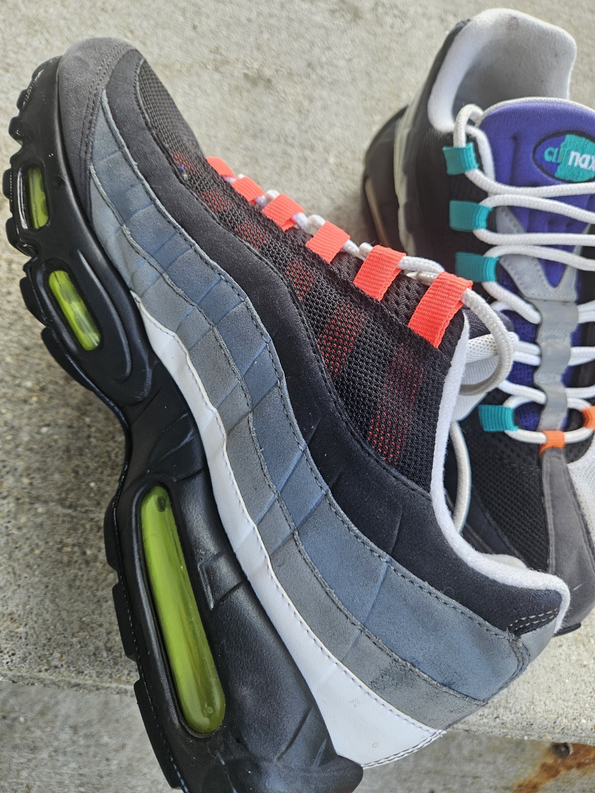 AIR MAX 95 WHAT THE size 10.5 US. I bought these about 10 years ago and wore them 3 times. They are in good shape, collector owned. There are small scuffs on both inner heels. I have included pictures of both areas. The outside/faces are in good shape. Soles show minor wear. I would give these a solid 8 overall condition. Maybe 8.5. I will accept returns if you are not satisfied with them I will keep them. Health reasons are causing me to downsize and to be honest I enjoyed this pair and it's time for someone else to enjoy them.
