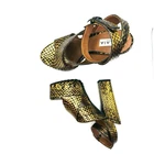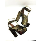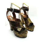 ALAÏA Gold Snakeskin Embossed Leather Platform Sandals Size 36.5 Color is a gold/brown tones Excellent condition original box and dust bag included A statement-making luxury shoe, blending bold design with meticulous craftsmanship. Genuine snakeskin leather with a metallic gold finish, giving it a luxurious and eye-catching texture. • Heel & Platform: A towering stiletto heel (typically around 5 inches) balanced by a sturdy front platform for added comfort. Snake embossed leather upper with manmade sole Made in Italy Ankle buckle closure Crisscross straps Almond toe with narrow block heel Approx 133mm/ 5.25 inch heel Approx 45mm/ 1.75 inch platform Measurements are approximate Featuring a bold platform heel, luxe metallic finish, and signature Alaïa craftsmanship — perfect for evening wear, parties, or high-fashion looks. Made in Italy.