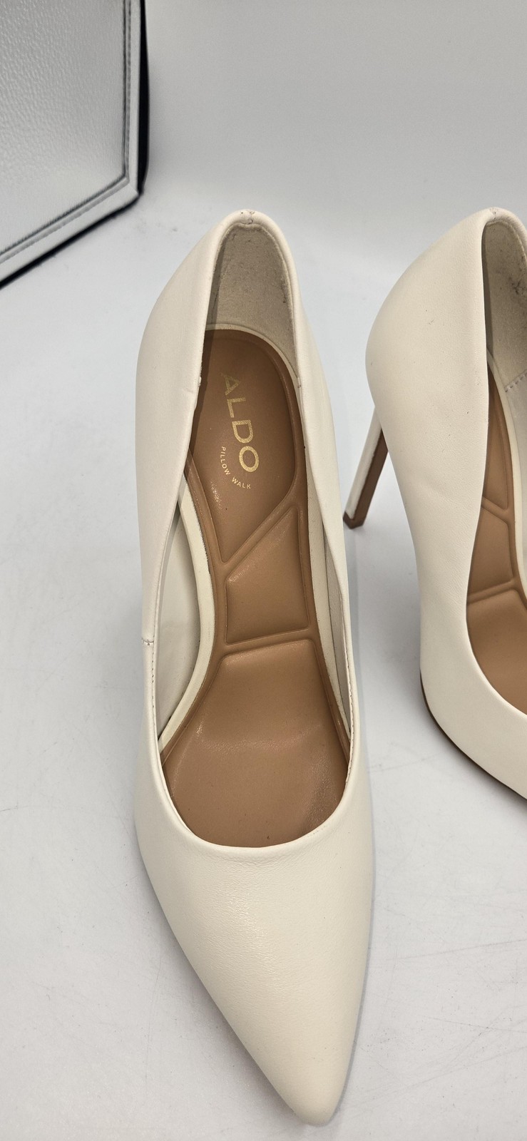 Brand: ALDO Style: Lala Pillow Walk pointed-toe high heel dress pumps. Color: White/off-white. Size: Womens US 7 (per packaging label marked "LALA 07.0"). Design details: Classic slip-on pump silhouette, closed pointed toe, high stiletto heel, cushioned Pillow Walk insole for added comfort, smooth upper and lining, textured rubber-look outsole. UPC: 627756635012 Special notes: Includes Aldo Group plastic packaging bag with barcode label as shown in photos.