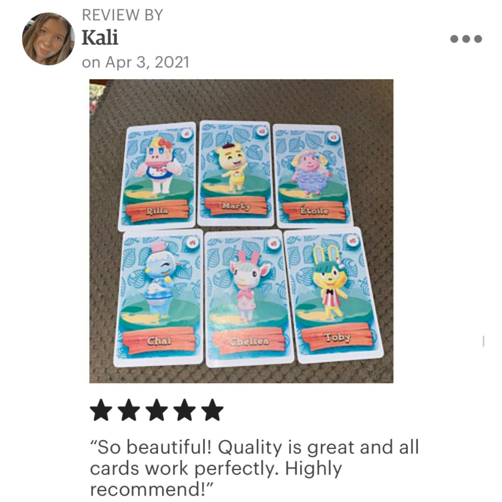 Page Title PICK YOUR VILLAGERS! Over 380 Villagers to Choose From! ➡ Please Read Description ⬅ Nearly every available VILLAGER in Animal Crossing:New Horizons and New Leaf can be YOURS ! ❤ Sanrio Series Villagers, Series 1-4, Welcome Amiibo Series, and Promo Villagers are all available ❤ You get to pick which ones you would like on your island! These are made to order! ONE FREE Villager for every FIVE Villagers ordered! (i.e. 5 + 1 Free, 10 + 2 Free, 15 + 3 Free, 20 + 4 Free, 25 + 5 Free) *Checking out with a purchase quantity of 5 cards means you will be receiving 6 cards in total* IMPORTANT: Message me after checkout with the names of your desired Villagers. Do not forget to include your FREE Villager's name (if applicable). If not, one will be randomly chosen for you. UNFORTUNATELY, THE FOLLOWING VILLAGERS DO NOT HAVE AN AMIIBO YET: Audie, Cyd, Dom, Judy, Megan, Raymond, Reneigh, and Sherb These Amiibo cards allow you to scan your favorite Villager onto your island and kick your unwanted villagers out (if your island is full). After three days of talking to the Amiibo villagers on the island, they will officially move into your island! ❤FREE Animal Crossing Leaf Decal Sticker with EVERY ORDER!❤ We use high quality PVC plastic cards with a Laser Printed High Resolution Graphic label of your Villagers image affixed to identify it. Please Note: These are custom handmade items, with high quality image resolution. They are third party items that scan into your gaming device exactly like the originals. Each card will bear graphics created by our shop, so they will be one of a kind! The intended purpose, which is to summon a villager, is 100% the same regardless of the image used . SHIPPING and HANDLING Card Qty Shipping Fee Tracking 1-3 FREE USPS ✖ 4-20 FREE USPS ✔ 20+ FREE USPS Priority ✔ 1-3 *Upgrade to First-Class or Priority Shipping ✔ REVIEWS TROUBLESHOOTING If you are unable to register the amiibo , try the following: Restart the console by holding down the POWER Button for three seconds, then select "Power Options" > "Restart." Reset the amiibo data. Try registering a different amiibo "FAILED TO READ AMIIBO" = This message usually requires a restart or an update may be needed. *Please reach out to our store if any cards do not scan. There is always the possibility of data loss due to exposure of extreme static electricity and magnetic fields during shipping.