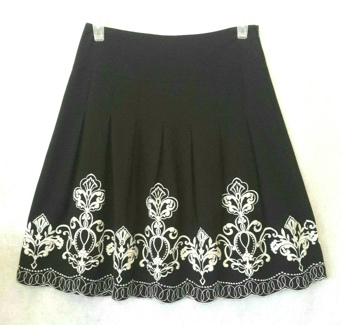 ANN TAYLOR SZ. 6 BLACK AND WHITE EMBROIDERED PLEATED SKIRT IN EXCELLENT CONDITION .. Please note that all measurements are approximate and variations in color differ from camera to monitors and that item may be slightly different than the photograph. I do my very best to describe things to the best of my ability and the utmost of honesty, however i am human, so please don't leave bad or neutral feedback without contacting me first if there's a problem,contact me asap and i will do my best to resolve it.!! I will leave good feedback after you leave feedback, that way i know you are satisfied.Pet Free / Smoke free home all items are steam sterilized.. Thanks for looking, please check out my other items listed... make a offer !! . .Offers that are less than half of price listed will be automatically rejected. Please feel free to e mail me if you have any questions...Thank you ..A Measurements: Waist 30" Length 24" completely lined 7" side zipper