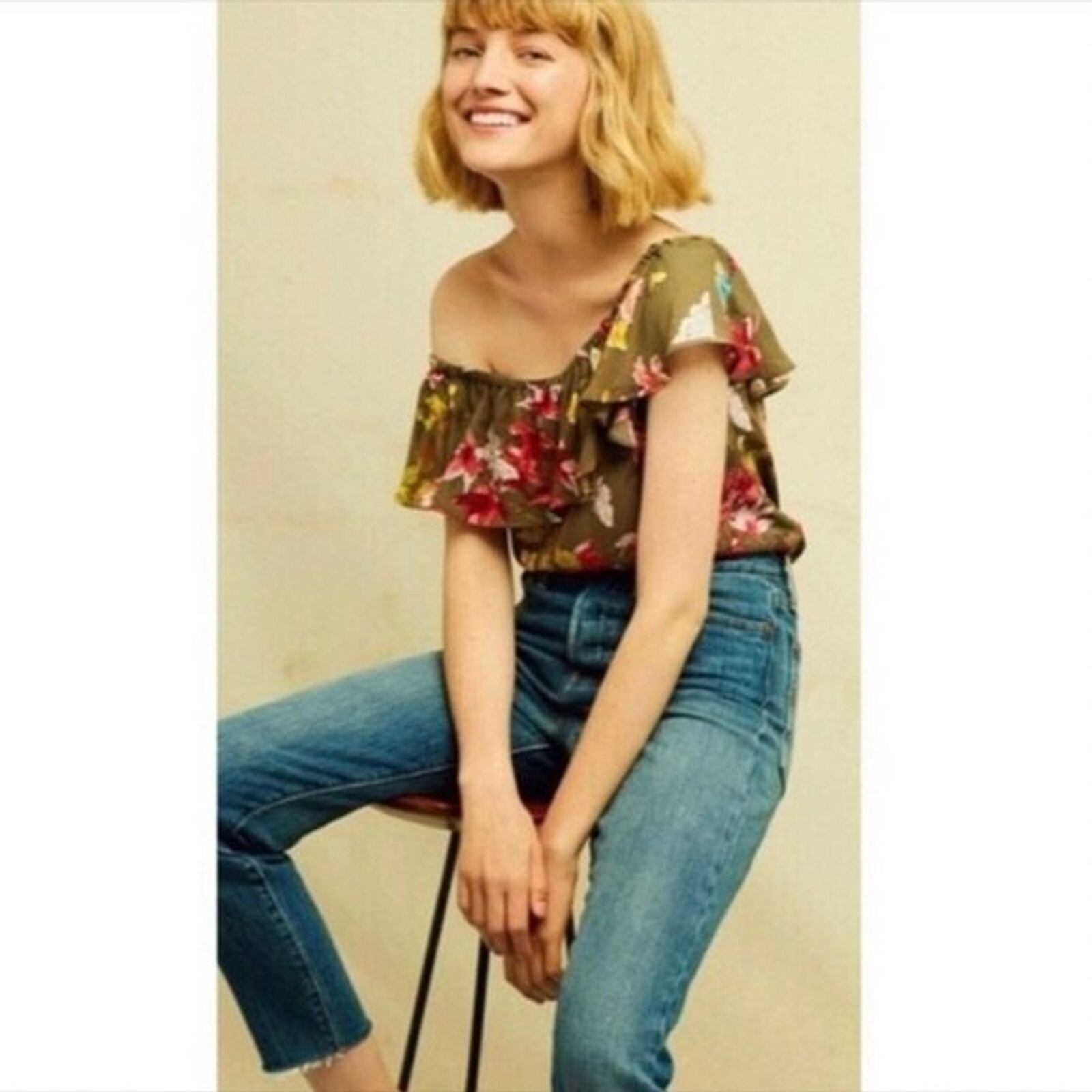 Add a pop of color to your wardrobe with this Anthropologie Maeve off-the-shoulder top. The olive green satin fabric is adorned with a vibrant floral pattern, perfect for any party or cocktail occasion. The relaxed fit and flutter sleeves provide a comfortable and stylish fit, while the pullover closure makes it easy to wear. This blouse is made of polyester and is available in size small, making it a great addition to any woman's wardrobe. The graphic print is sure to catch everyone's eye and the colorful theme is perfect for any season, whether it's winter, summer, spring, or fall. ANTHROPOLOGIE MAEVE Off Shoulder Top olive green colorful floral size small Excellent condition with no flaws
