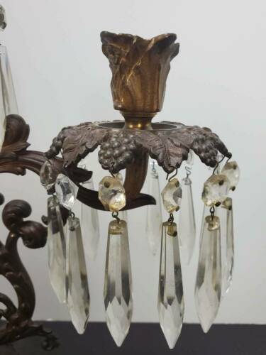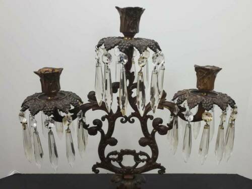 ANTIQUE BRONZE THREE ARM CANDLELABRA BLAKES PATENT, 19TH CENTURY Available for your consideration is this lovely three arm candelabra by Blake. Circa 19th century. This beautiful candelabra is either cast brass or bronze. It is decorated with leaf shaped holders and grape leaf and fruit bobeches. Each bobeche has x prisms. Marked "BLAKES PATENT" on the lower back side. The candelabra measures approx. 16 1/2" tall and 14 3/4" wide. Base measures approx. 8" wide and 4" deep. In very good antique condition. Bronze has been orange oiled. No chips, cracks, breaks or repairs found. Shed find, prisms may need a better cleaning. The pictures are an important part of this listing. Please use them as a condition aid. If you require additional photos or have questions please email before bidding. Thank you for looking. ATTENTION INTERNATIONAL BUYERS: Please understand that all international shipments will be shipped with full value declared. We will not falsify customs documents for any reason. It is illegal. I sell Vintage and Antique items therefore it is not always possible to include all scratches, imperfections etc. *COLORS ARE OUR BEST JUDGEMENT, SO PLEASE SEE PICTURES Please be aware my photos are considered part of the listing description and the description is based on my own knowledge, experience, and research. Statements regarding maker, age, origin, etc. particularly on unmarked pieces, should be evaluated and confirmed by you the buyer, as you are the final judge. Please ask questions that will help you in these evaluations. I also encourage and gladly accept opinions from knowledgeable buyers which only helps to make me a better seller and serve you better. Descriptions are as inclusive as possible but i f I miss something that is important to you please email me prior to bidding. I am always willing to combine shipping when practical. CT residents must add 6.35% sales tax. See my other listings for more great items! We accept PayPal and certified checks only. Shipping is generally the day following the receipt of payment via USPS or FedEx. If you have a preferred shipper please let me know. txzj pxzj24187 txzj-11 txzj85 txzj115
