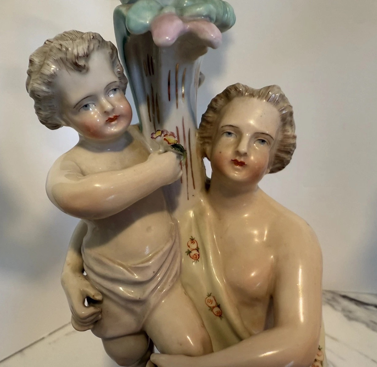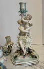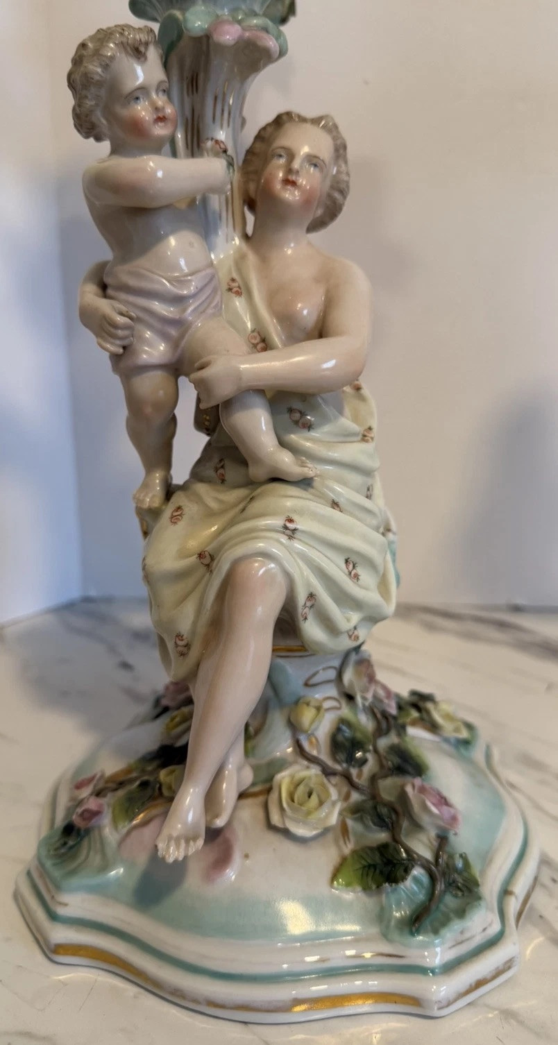 ANTIQUE German SITZENDORF Porcelain Dresden Figural CANDELABRAS Set Of 2 Gorgeous pair of antique figural candelabras with exquisite porcelain applied flowers, see all photos. Circa late 1800’s/early 1900’s. Sitzendorf mark/stamp on bottom indicates age to be around that time. These are appx 18” in height and consists of 2 pieces (base & top) You can utilize just the bottom portion of each as a candle stick holder, or add top piece for a 5 candle candelabra. Note: Small chips on floral leave stem as shown in photo but very minor and not noticeable, you will notice some gold paint has rubbed off in areas as shown in photos. See photos for best representation. Overall these are in great condition for age. Note: These will be shipped with the best of care and packaging, and will require signature at delivery. Thank you for looking and supporting my small business!