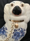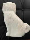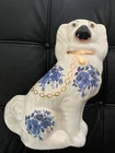 BEAUTIFUL ANTIQUE / VINTAGE white porcelain Staffordshire Spaniel Figurine with blue floral detail, gold collar/chain. Classic piece for fireplace mantle and hearth. Please see brushstrokes on snout, and HOLE in the back which denotes the firing technique of the older figurines. No chips or cracks, in great vintage/antique condition. Measures 11" tall, base is 6" wide. Was in the family for many decades. Comes from a smoke-free environment. Please ask all questions prior to bidding as all sales are final. Also, please reach out to me if international shipping is desired, as this listing only accommodates domestic shipping in the continental United States. Thank you for your interest!