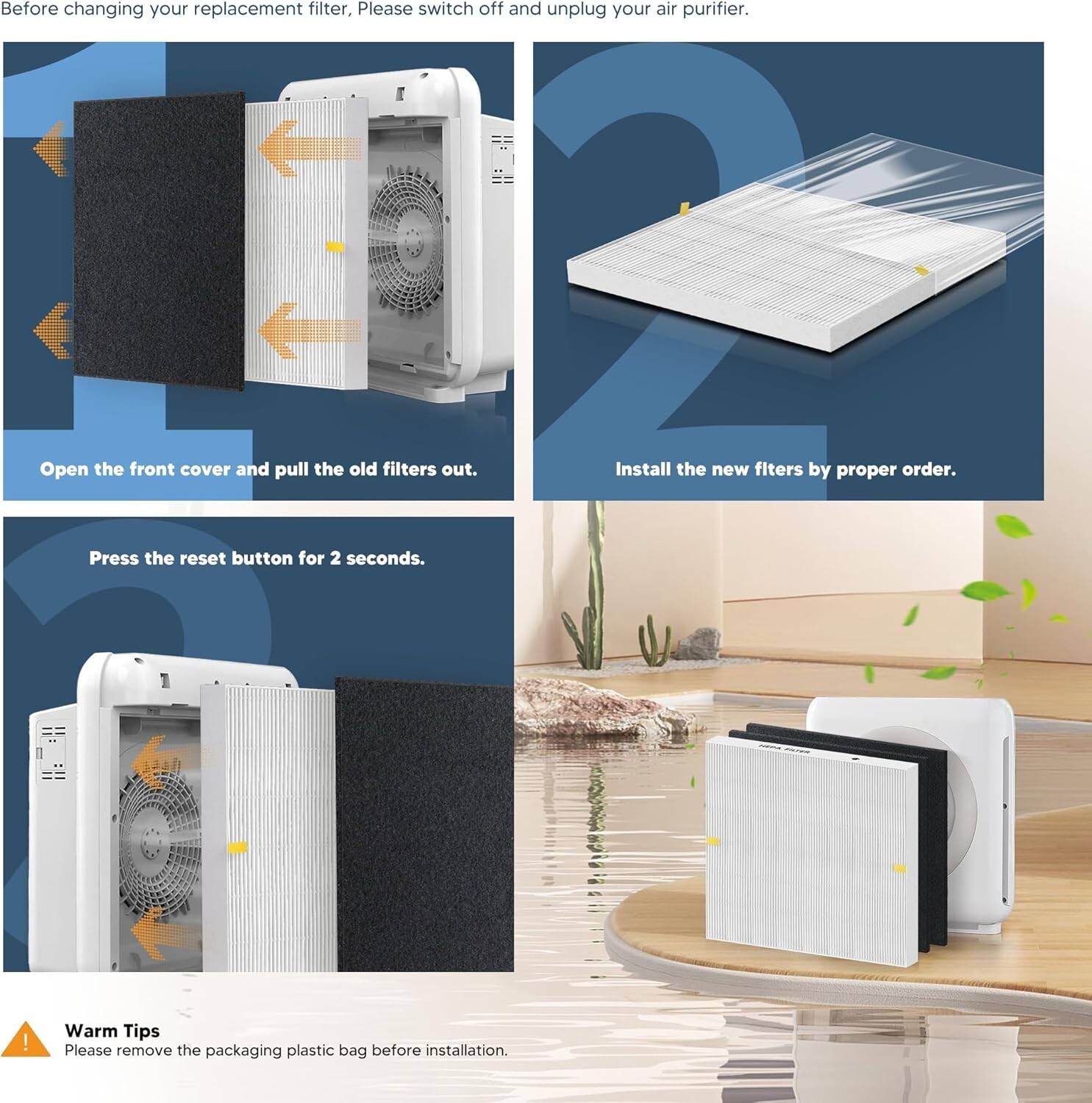 Replacement Fitters: Set includes 2 True HEPA filters and 4 carbon filters, designed to replace used filters in Coway Air mega AP-1512HH and 200M air purifiers . Activated carbon filter helps reduce unwanted odors from pets, smoke, cooking fumes, and harmful VOC's emitted from a variety of household products and chemicals. Premium Quality: Our AP-1512HH air filter replacement is made of high quality non-woven fabric, constructed with premium HEPA 13 to greatly improve the performance of your AP-1512HH filter replacement. We adopt advanced lower energy consumption and lower density structure technology, higher efficiency and less pressure to ensure maximum filtration. Perfect Replacement: AP-1512HH filter replacement is highly compatible for 200m series AP-1512HH/AP-1512HH-FP/AP-1518R/AP-1519P mighty air purifier. Replace Part 3304899 Easy Installation: We recommend you to replace your AP-1512HH HEPA filter every 6 months and pre-filter every 3 months for optimal performance (depending upon your usage and environment). It is fairly easy to install the AP-1512HH Air filter, no tools required. Simply take out and replace from your machine unit when needed. After-Sales service: You will not only receive great guarantee, but also air filter replacement for coway with 30 days free return and exchange service. Any questions, you can contact us, we will try to give you a satisfactory solution.