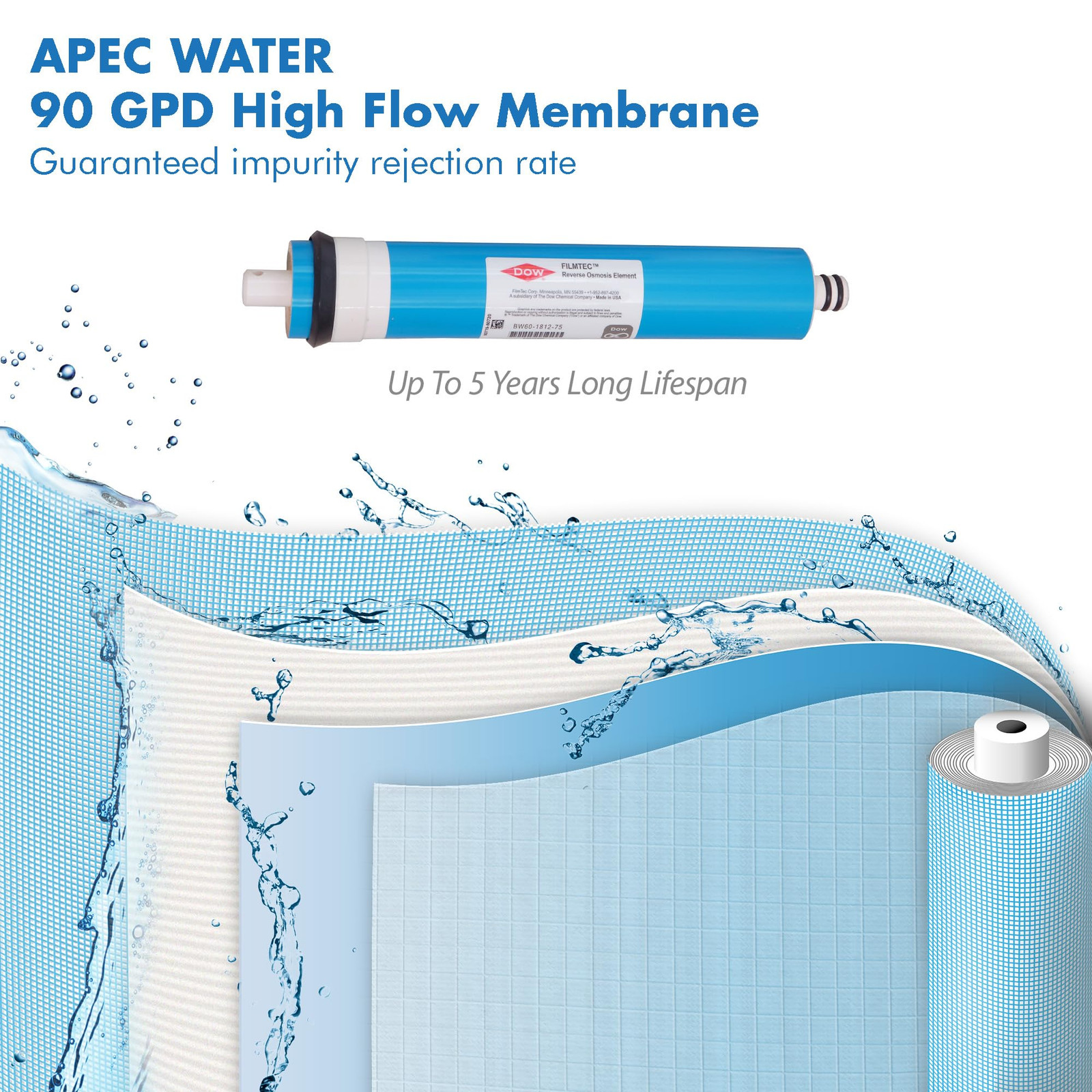 APEC Ultimate high flow 5-stage complete filter set is made in USA with the highest quality filtration components to provide a longer lasting filter set to protect and prolong the lifespan of your Reverse osmosis system. Premium quality pre-filter cartridges lasts over 12 months while the membrane and post carbon filter last 3-5 years for fewer filter change outs and high performance impurity removal. Compatible for APEC RO-90, RO-PERM, and all other standard size under counter 50-90 GPD RO systems on the market. 1St stage: high-grade 10 inch high-capacity polypropylene sediment filter -removes dirt, particles, and rust. 100% pure polypropylene depth filter with exceptional dirt-holding capacity translates to longer life and fewer change-outs than existing string-wound or resin-bonded filters. 2nd and 3Rd stage: premium extruded carbon block 10 inch -gets rid of unpleasant chlorine, tastes, odors, cloudiness and colors. Also removes VOC and other common harmful agents from the water. Apec's extruded carbon block filters consist of activated carbon particles fused into a uniform block with enhanced adsorptive capacity and efficiency. Unlike granular activated carbon (GAC) filters, these extruded carbon block cartridges will not channel or bypass due to the extreme uniformity of their extruded activated carbon core. 4th stage: high rejection 90 GPD TFC reverse osmosis membrane. Removes a wide variety of impurities including arsenic, chlorine, lead, fluoride, chromium, radium and more. 5th stage: advanced coconut shell refining carbon 10 inch - TCR filter removes any possible residual taste from the tank. For over 20 years, apec has been an industry leading manufacturer of high performance ro systems. APEC ultimate high capacity 5-stage complete filter set is USA made and designed to last 2X longer Includes (1) sediment (2) carbon block filters, (1) Dow Filmtec membrane and (1) inline carbon filter Filmtec 90 GPD membrane is individually lab tested to guarantee the highest rejection rate Certified to remove up to 99% of all contaminants for the best Drinking water quality possible Compatible with APEC RO-90, RO-PERM and most industry standard reverse osmosis system with 10 inch x 2.5 inch filter housings