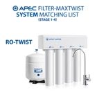 APEC supreme complete filter set FILTER-MAXTWIST is made with high quality filtration components to protect and prolong the lifespan of your reverse osmosis system. The twist-lock design allows easy and secure filter change-out. Just twist and replace your water filter in a snap. Premium quality filter set lasts over 6 months for high performance contaminant removal, while the RO membrane and post-carbon filter last 12-24 months. Compatible with APEC twist-lock RO system. 1st stage sediment filter removes dust, particles, and rust. Protects and extends the life of the membrane and system. Recommend changing every 6-12 months. 2nd stage carbon filter removes chlorine, tastes, odors, cloudiness and colors, as well as removes VOCs and other common chemicals from the water. Protect thin film membrane. Recommend changing every 6-12 months. 3rd stage reverse osmosis membrane removes up to 99% of total dissolved solids and other water contaminants such as arsenic, lead, fluoride, chromium, radium and much more. Recommend changing every 12-24 months. 4th stage post-carbon filter removes any possible residual and taste. Recommend changing every 12-24 months. High capacity 4-stage complete filter set, compatible with APEC twist-lock RO system Includes (1) sediment filter (1) carbon block filter (1) reverse osmosis membrane and (1) post-carbon filter Removes up 99% of all contaminants for the best drinking water quality possible Pre-filters last 6-12 months for high performance contaminant removal; the 75 GPD membrane and post-carbon filter last 12-24 months Featured twist-lock design allows easy and secure filter change out