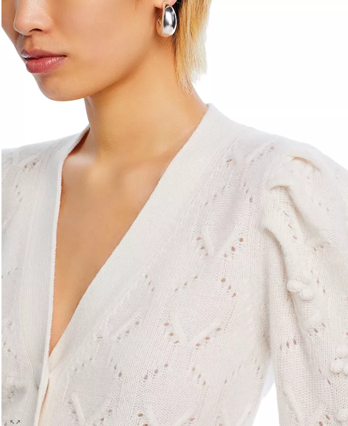 AQUA 100% Cashmere Pointelle knit V-Neck Cardigan size: Large color: Ivory V-neck Long sleeves with pleated puff shoulders and popcorn-knit detail Front button closures Allover pointelle knit Ribbed trim at cuffs and hem 100% Cashmere retail $198 underarm to underarm 21" collar to bottom 23" C22