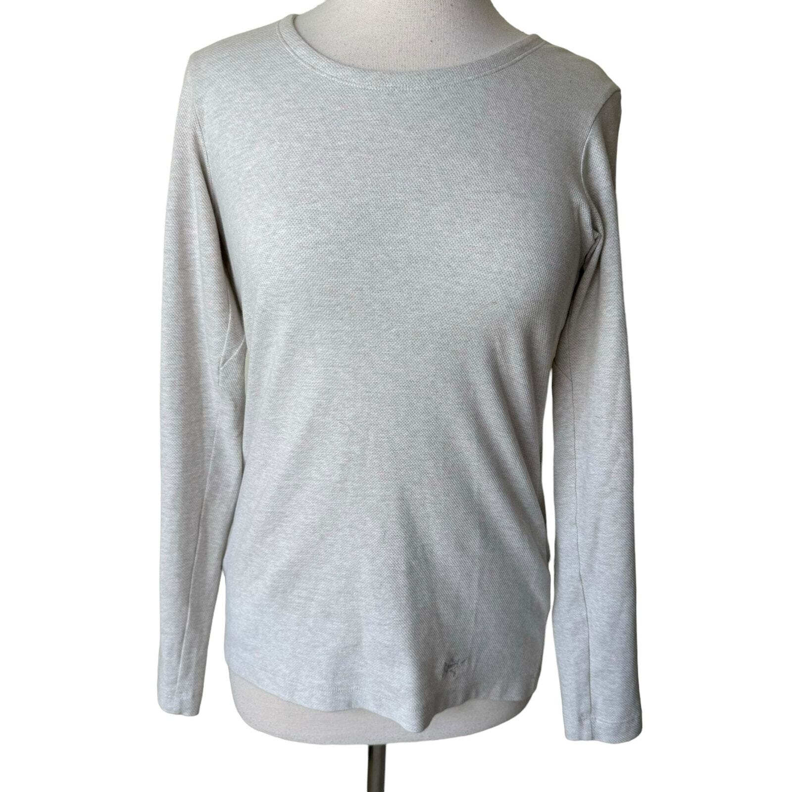 ARC'TERYX Women's Sirrus Long Sleeve Top Oatmeal Size SMALL Natural, casual style and comfortable technical performance come together in the Sirrus, a crew neck top designed for easy weekends and daily wear. Made from DryTech™, a quick-drying, subtly textured cotton/polyester blend that pulls moisture off of the body for rapid evaporation, the Sirrus stays cool and dry on the move. The scooped neckline creates a finished look and layers nicely under a sweater or button front. Excellent pre owned condition. One tiny pin hole at the back of the neck and one line on the front that I can't tell if it's just the heathering, or a faint gray/ black line. Either way-- it should come out in the wash! Great layering piece!
