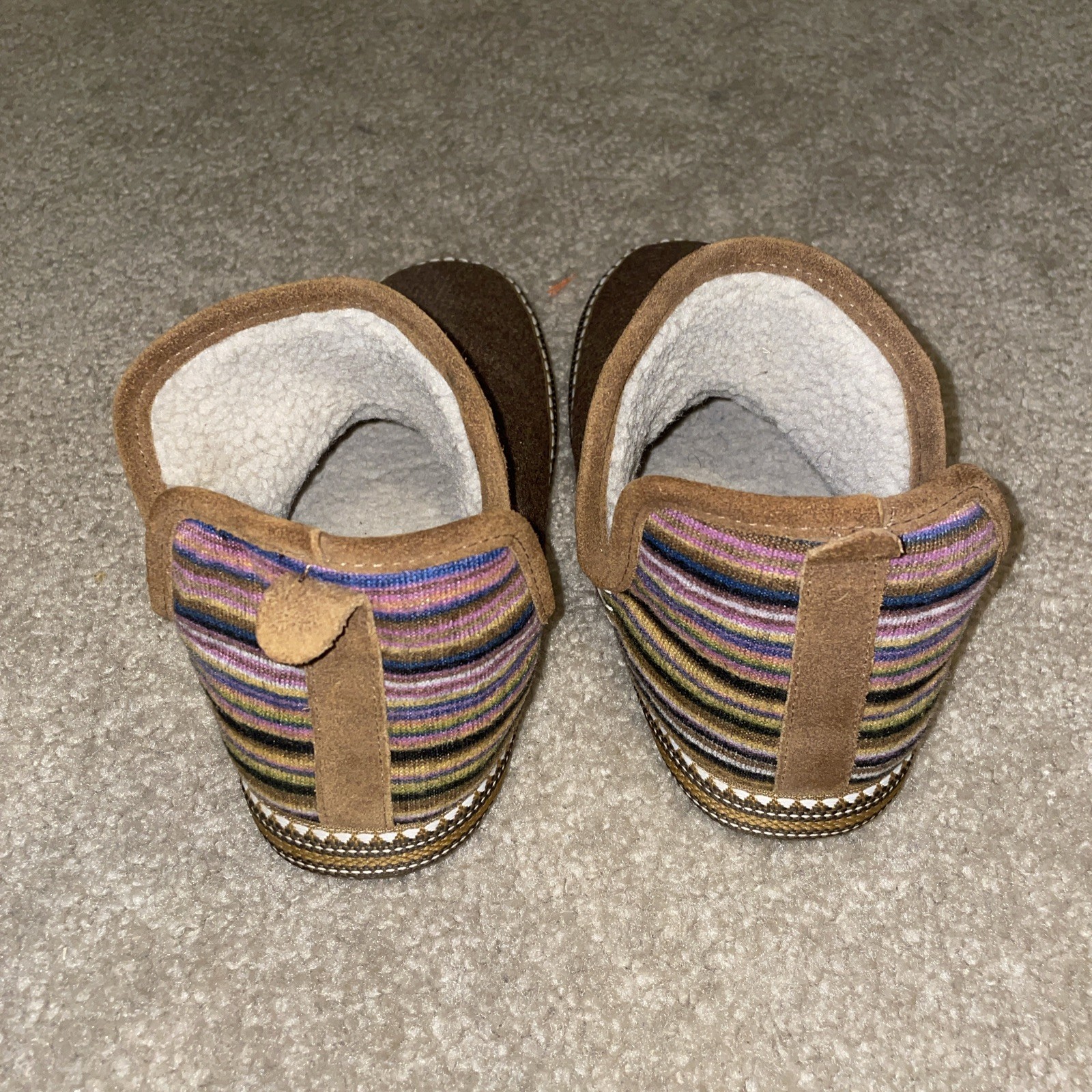 The product is a pair of ARIAT Women's wool blend booties slippers in size small (6.5-7). These slippers are designed with a fleece lining for added warmth and comfort. Made with wool as the upper material and a brown color, these booties offer both style and functionality for women looking for cozy yet stylish footwear. Perfect for lounging or running quick errands, these slippers are a versatile addition to any woman's wardrobe.