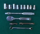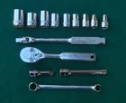 ARMSTRONG 14 piece 1/4" drive SAE Socket Wrench Set with Box manufactured by Armstrong Bros., Chicago, Illinois * this set contains: NM606 3/16" 6-point marked ARMSTRONG ** NM607 7/32" " NM608 1/4" " NM1210 5/16" 12-point marked ARMSTRONG MADE IN USA NM1211 11/32" 12-point marked ARMSTRONG NM1212 3/8" " NM1214 7/6" " NM1216 1/2" 12-point marked ARMSTRONG MADE IN USA ARMALOY NM1218 9/16" 12-point marked ARMSTRONG MADE IN USA ARMALOY (with logo) 10-919A 1-inch extension marked ARMSTRONG 1/4 10-922A 3-inch extension marked ARMSTRONG USA 1/4 NM42 6-inch flex handle (breaker bar) marked ARMSTRONG U.S.A. ARMALOY NM91 Oval-Head Ratchet marked ARMSTRONG U.S.A. 6723 3/8" 12-pt box wrench x 5/16" 12-pt flare nut wrench marked ARMSTRONG MADE IN USA SPECIAL * the 10-919A one-inch extension and the 10-922A three-inch extension are not original to the set, and are of later production than the other (original) pieces in the set - presumably manufactured after the acquisiton of Armstrong by the Apex group. they are both add-ons to the set and are NOS. - Several of the pieces in the set have light engraving marks from a previous owner. (looks like "EH" or "LH") - No chips, cracks, peeling chrome, and nothing is rounded out. - The box, as odd as it is, came with the set. I have no idea if it's original. Works fine. Latch is very cool. - I have no clue on the wrench. 5/16" flare nut? Marked "Special". - I found another Armstrong 1/4" dr 5/16" 12-pt socket in another box and I'm tossing it in with the deal here. ** there are TWO NM606 3/16" sockets in this set. 07/31/24 - Ratchet works just fine. - Exceptionally well-made tools with lustrous chrome in excellent condition. This item is sold as is. There is no guarantee or warranty, either express or implied, regarding merchantability or fitness for a particular use or purpose. All sales are final. No returns, no exchanges, no cancellations, no refunds. I ship only to destinations within the 50 U.S. States, and only to buyers who pay immediately through PayPal. These terms are expressly in lieu of any and all other terms, "user agreements", or "terms of use", and no party has the authority to vary or extend them. Bidding on this item or clicking "Buy Now" indicates your full agreement with seller's terms.