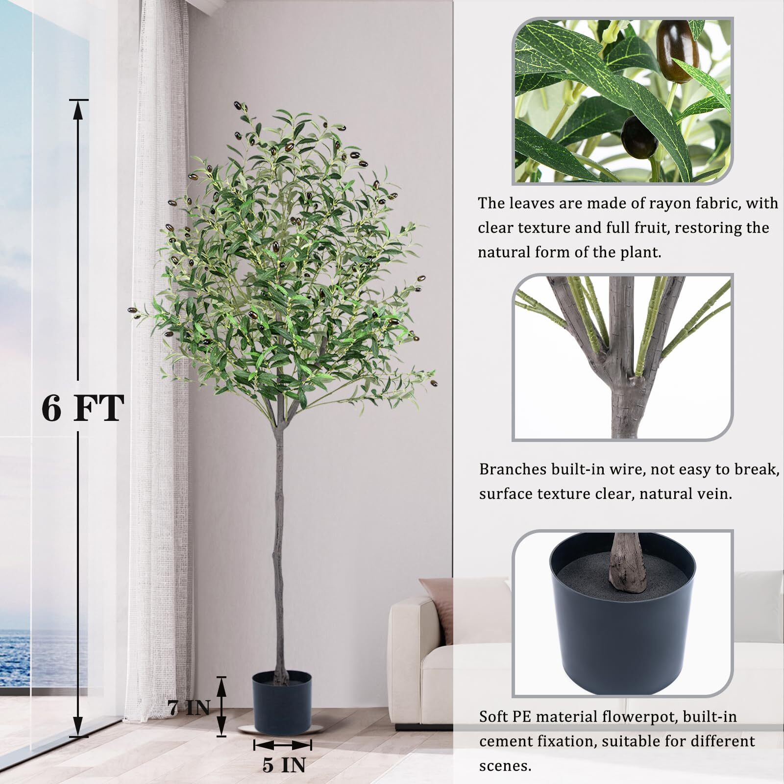 Artificial Olive Tree 6ft, Olive Tree Artificial Indoor, Faux Olive Trees Indoor 6 Feet, Fake Olive Tree, Artificial Olive Trees for Home Decor Indoor Artificial Tree Plant Lifelike Simulation: A artificial olive tree that looks exactly like a real olive tree, with each leaf and fruit exquisitely crafted to replicate their genuine counterparts, Lifelike bark texture tree trunk and lush olive leaves and fruits make the faux olive tree creating a decoration that appears just like a real olive tree and enhances the room, making it an ageless home decor item Quality: This faux olive tree in pot features high-quality polyester materials and iron wire in its stems and branches, making the fake olive tree resistant to deformation and aging. The olive trees's leaves are made of artificial silk fabric, which is durable and easy to clean, ensuring that this tall fake olive tree can bring an elegant and romantic atmosphere to any room for many years. The olive trees artificial indoor makes the perfect gift for friends or family on occasions such as Christmas, Thanksgiving, housewarming, birthdays, or Valentine's Day Perfect decoration: The faux olive tree 6ft is perfect for a variety of commercial places, such as offices, shops, entryways, hallways, bedrooms, classrooms, and shopping malls, as well as for personal spaces like homes, living rooms, and reading rooms. The olive tree artificial symbolize peace, tenacious fighting spirit, life, and eternity, making them a meaningful and elegant addition to any space Free Maintenance: The artificial olive tree indoor stands at 6 feet tall and has a pot base that measures 7 inches and is filled with concrete. The base is covered in black sand and olive tree artificial is adorned with 1176 olive leaves and 72 olive fruits, creating a stunning and elegant display. This faux olive tree requires no water, sunlight, pruning, fertilizing, or special care, and the olive tree 6ft will maintain its appearance and freshness throughout the year. The nearly natural olive tree will never fade or die, and if the olive plant artificial gets dusty, simply wipe it clean with a damp cloth Easy to Assemble: The olive trees artificial indoor are easy to assemble and separate. This artificial olive tree is a perfect interior decoration, and the 6ft olive tree adds a touch of greenery and natural ambiance to your space. We are committed to providing satisfactory service. If you have any questions in the process of purchasing or using the olive trees, please us in time, we will be happy to serve you Note: White decorative pot in picture is included Perfect Decoration: The artificial olive tree 6ft features a realistic bark texture on its trunk, along with abundant olive leaves and fruits that give it the appearance of a stunning work of art. As a symbol of peace, victory, and hope, the 6 ft artificial olive tree is ideal for a diverse range of commercial settings, including offices, shops, entryways, hallways, bedrooms, classrooms, and shopping malls. It's also perfect for personal spaces, such as homes, living rooms, and reading rooms. Lifelike Olive Tree Artificial: The 6ft olive tree artificial of trunks, branches, and leaves have been carefully designed and manufactured to truly replicate real plants, specifically the olive tree. They are incredibly lifelike and can sway in the breeze when it is windy, creating a natural and comfortable atmosphere. They add color to your room and bring you comfort. Strong Trunk:This artificial olive tree plant with a sturdy and durable construction, this faux olive plant in a pot boasts high-quality materials and a strong trunk. The stems and branches are made of plastic and iron wire that can withstand aging and resist deformation. Additionally, the leaves are crafted from artificial silk fabric, making them durable and easy to clean. This tall fake plant will infuse your space with elegance and romance for many years to come. Faux Olive Tree Pot: This faux olive tree pot is made of soft PE material, is designed to securely hold the tree in the center. It is filled with cement and covered with black sand, providing stability and security. The addition of dried moss as a cover enhances its overall appearance, adding to its beauty and harmony. Free Maintenance:This artificial olive trees for home decor indoor is an ideal room decoration for people who love plants but don't have the time or energy to care for a real one. It doesn't require sunlight, watering, pruning, or fertilizer, making it a hassle-free maintenance option. Tree Size: 6ft/70inch/180cm from the pot bottom to the treetop when leaves are in the upright state Black Nursery Pot Size: 5inx7in(HxW) Leaves: 1176 Olives: 72 Shipping We offer FREE shipping on all orders! We ship within Three business days of payment, usually sooner. We use a selection of shipping services such as UPS, FedEx, USPS etc., unable to choose a carrier. We only ship to the lower 48 states, no APO/FPO addresses or PO Boxes allowed. Sellers generally can’t change the shipping address that you provided at checkout. Local pickups and combined shipping options are not provided at this time. International buyers - please note: Import duties, taxes, and charges aren't included in the item price or postage cost. These charges are the buyer's responsibility. Return You can return a product for up to 30 days from the date you bought it by using the seller's FREE RETURN LABEL only. Any product you return must be in the same condition you received it and in the original packaging. International buyers - Rejection and return of the product requires the buyer to pay all shipping and return costs. Please return with the reason "Order mistake" or "Changed my mind" or "Does not fit" for a refund, which would be greatly appreciated. If the buyer wishes to return the items for a refund or replacement, please contact the seller to obtain a free return label. The refund or replacement will be processed using the tracking numb