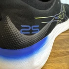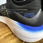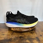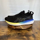 ASICS Gel-Nimbus 26 Running Shoes in Blue, size 15, feature a lace-up closure, low-top design, and standard shoe width. These athletic sneakers are designed for comfort and breathability, with cushioned foam insoles and a rubber outsole. The synthetic upper material is paired with a fabric lining, making them suitable for various activities like walking, cross-training, and running. The design includes a solid pattern and a colorful, sporty theme.