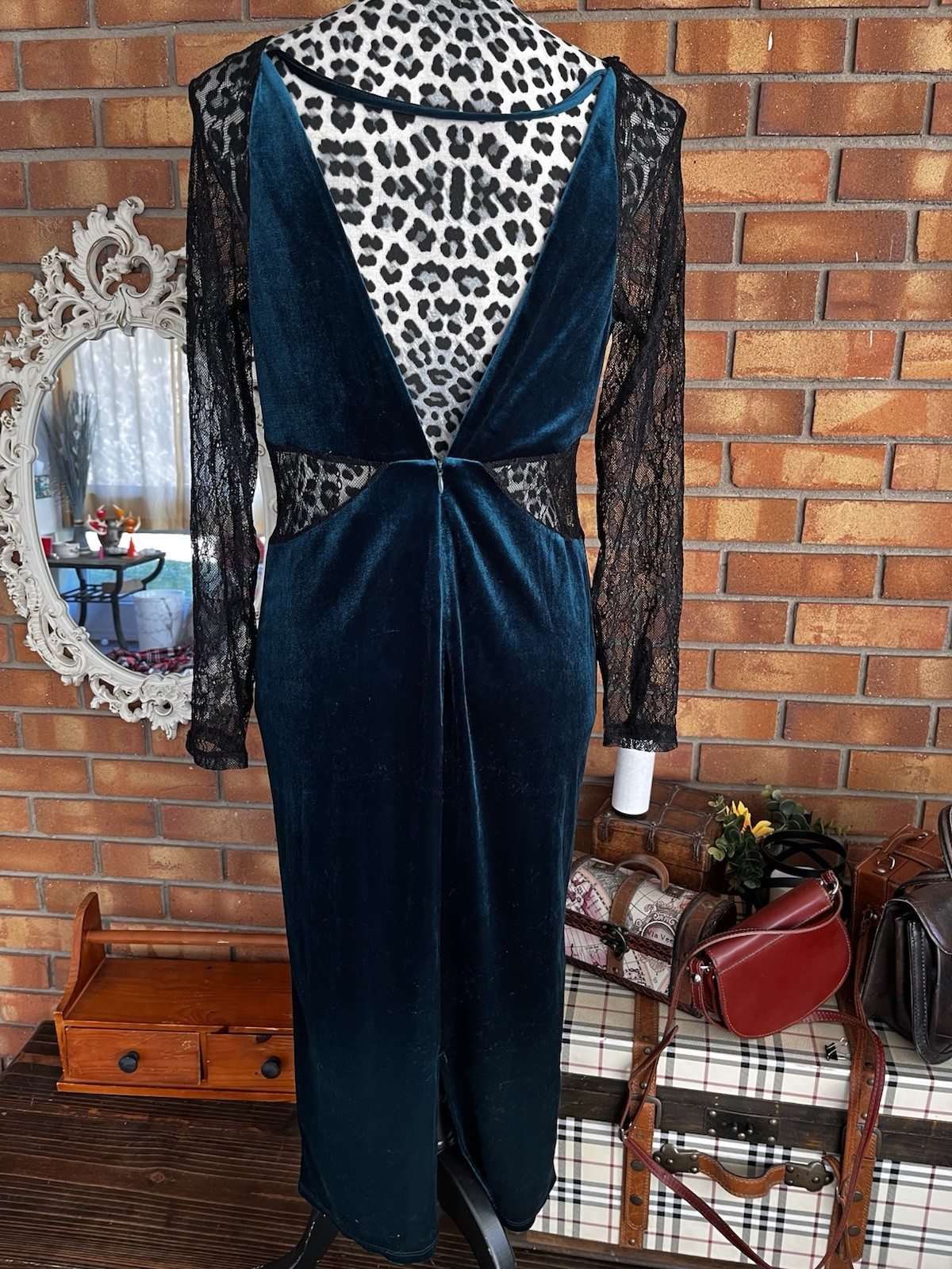 ASOS Design Green Velvet Black Lace Dress (10) Holiday Formal Long Sleeve Luxury. Condition is Pre-owned - Excellent. Shipped with USPS Ground Advantage.
