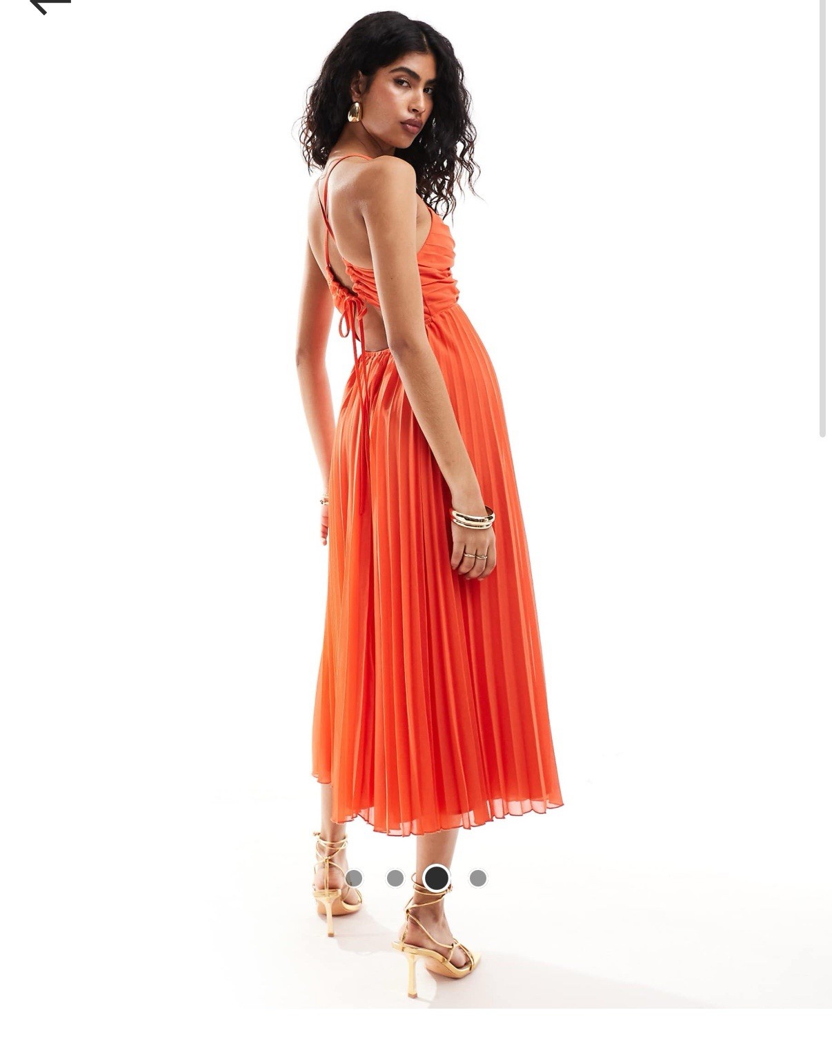 The ASOS Design Women's Pleated Bodice Strappy Midi Dress in Coral, size 6, is a stylish and versatile option for various occasions. The sleeveless design, halter neckline, and A-line silhouette make it perfect for both party events and casual outings. Made by ASOS, this midi dress features pleated accents and is machine washable for easy care. The vibrant coral color adds a pop of summer flair, making it a great choice for the warmer seasons. Pair it with strappy sandals and statement earrings for a chic and trendy look.