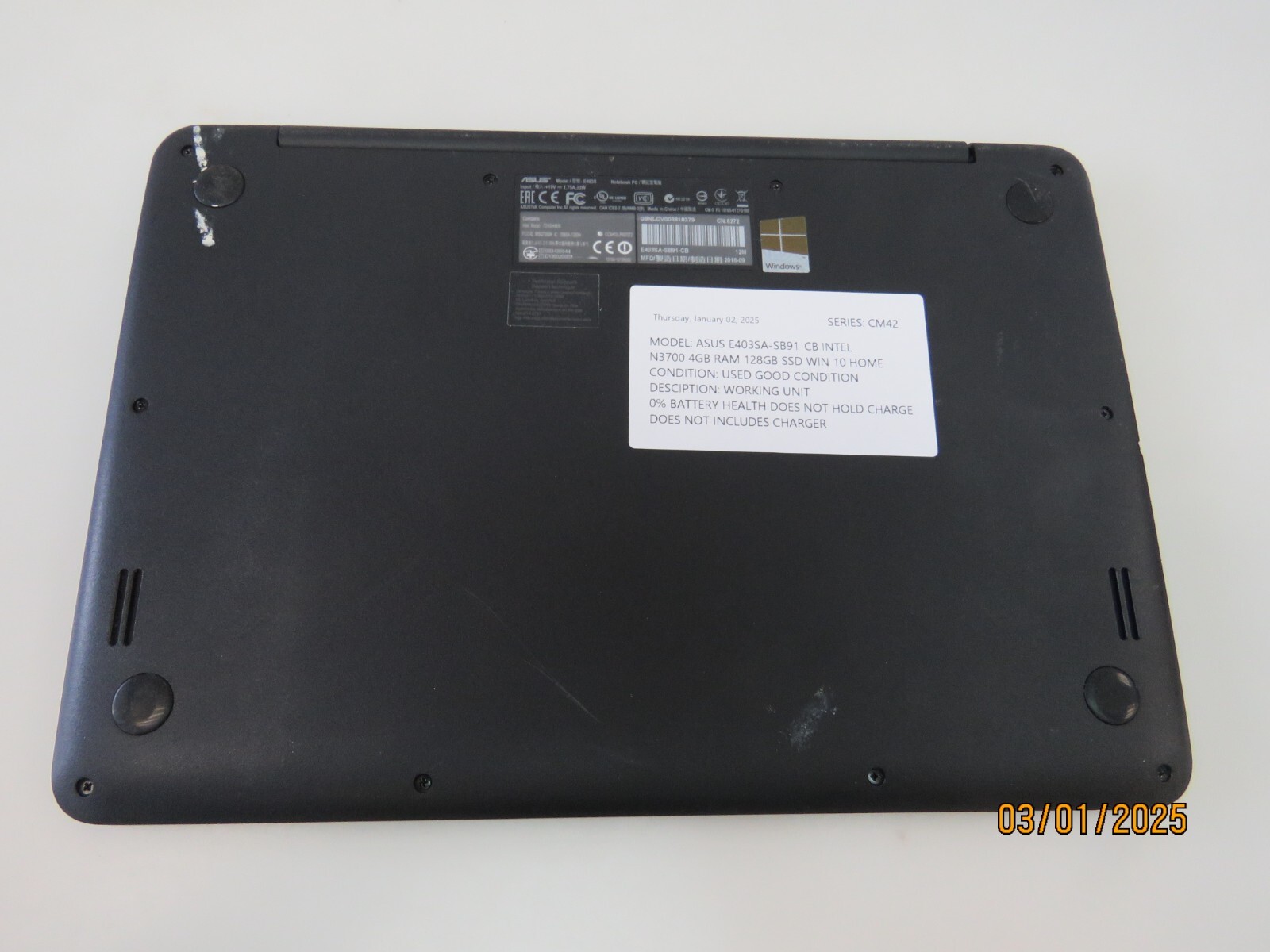 ASUS E403SA-SB91-CB INTEL N3700 4GB RAM 128GB SSD WIN 10 HOME [CM42] Functional Condition: Tested and Functional With Issue. ISSUE: Battery Does Not Hold Charge At All. Laptop Only Works When Plugged In. Charger Not Included. Cosmetic Condition: This is a Used Item and Normal Wear (Scuffs & Scratches) is Expected. Items included in this listing: Laptop Items NOT included in this listing: Charger Thank you for Shopping with Us! ENJOY Free Shipping in USA & Low Cost Shipping to CANADA! Terms of Sale NOTE: Our Listings only include items as pictured - Please do not assume any item is included if its not pictured. We will try our best to picture all items included in this listing as well as its cosmetic condition. We Guarantee & Stand Behind our product and commitment to provide you with o nly Original, Branded, OEM & Genuine Products Shipping A complete and correct shipping address is essential. We cannot guarantee the shipping address can be changed after checkout. Sales Tax will be charged to all Canadian & USA Buyers. Combined shipping is not guaranteed. We are unable to change any content of your order based on the eBay checkout note or PayPal message. Customers with shipping addresses outside of the U.S.A and Canada are responsible for all duties and import taxes. Please contact your customs for information Bidding All items are accurately described and pictured. Please ensure you are consciously bidding on the items as described. Payment Payments are expected at the time of purchase or in case of Auctions, at the end of auctions. Payments are managed via eBay Managed Payments Contact Us Your positive feedbacks are extremely valuable to us. If you have any concerns about your order, please contact us through eBay message to resolve any issues before leaving a negative feedback or opening a dispute. We will reply within 24 Hours Return Policy All items are in used condition unless specified.