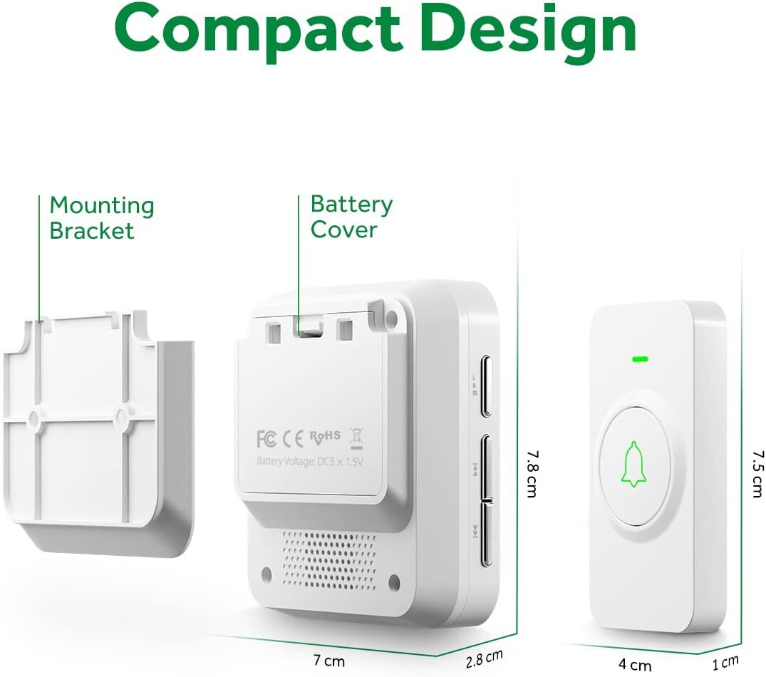 AVANTEK Wireless Door Bell, WA-11 Waterproof Battery Operated Doorbell Chime Operating at 1000 Feet, Portable Door Chime kit with 52 Melodies, 5 Volume Levels, and CD Quality Sound Item Description NOTE: The battery-operated doorbell kits only pair with our battery-operated doorbell kits (Model number: BA-11/WA-11), and they do not match other kits or accessories in our store. CONVENIENT BATTERY-POWERED RECEIVER: This battery-operated doorbell is powered by 3 AAA batteries (included) so no electric outlet needs to be occupied; simply screw the mounting bracket onto the wall and then hook the receiver on 1000 FT/300 M ULTRA LONG WIRELESS RANGE: Will not interfere with other equipment in your home or those of your neighbors; ensures you will never miss a visitor, even if you are a few rooms away or on another floor 52 CHIMES TO CHOOSE FROM: 29 mm stereo speaker delivers rich and crisp sound; 5 adjustable volume levels with a maximum setting of 120 dB; press Next or Previous button to easily choose from 52 melodies HIGH PERFORMANCE TRANSMITTER: Ultra-low power consumption; uses CR2032 lithium battery that boasts 3-year maximum lifespan; IP55 dustproof and waterproof rating; works between -4 °F to 140 °F; withstands various harsh weather conditions MEMORY FUNCTION: Remembers your last melody and volume level after the battery replacement; no need to reset to your previous settings; convenient and easy-to-use design for an enhanced user experience › See more product details *Easy and Simple Use Mini and sleek, this battery-operated doorbell allows you to place it *Built Tough for Any Weather With IP55 weatherproof protection, this wireless doorbell is guarded against rain, dust storms, or extreme temperatures. *3-Year Battery Life The built-in 230 mAh CR2032 lithium battery has an extensive 3-year lifespan, saving you the hassle of having to buy and replace batteries all the time. *Music to Your Ears You are free to choose 52 different melodies as the mood strikes you, ranging from traditional doorbell chimes to jingles. Mini and sleek, this battery-operated doorbell allows you to place it With IP55 weatherproof protection, this wireless doorbell is guarded against rain, dust storms, or extreme temperatures. The built-in 230 mAh CR2032 lithium battery has an extensive 3-year lifespan, saving you the hassle of having to buy and replace batteries all the time. You are free to choose 52 different melodies as the mood strikes you, ranging from traditional doorbell chimes to jingles. Adjust the volume through its 5 levels of 0–120 dB to meet your needs. In mute mode (0 dB), your sleeping baby won’t be disturbed. The long transmission range ensures you will never miss a visitor, even if you are a few rooms away or on another floor. Payment We accept payment only through PAYPAL Shipping We ship products worldwide through standard express courier service, it will reach within 7 to 10 days to abroad buyers, we ship the product after recieved clear payment and give full information about shipment to the buyer Return We accept product return within 7 to 21 days from delivery date but product should be in original position and not in damaged condition,the return shipping charges will be buyer responsibility