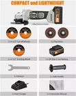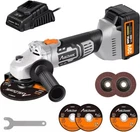 4-pole Motor with High Speeds, More Powerful for Grinding & Cutting - Equipped with 4-pole motor with no-load speed of 7,500 RPM, this metal grinder is stronger and more efficient than regular brushed 2-pole motor angle grinder tools in grinding metal, and cutting tile and concrete Large Capacity 3.0A Battery with Safe Protection and Fast Charger - Featured with charging and discharging protection, this battery of this handheld grinder ensures safe charging. Worked with fast charger, it can be fully charged with within 1-2 hours and 3.0Ah large capacity extends working time both indoors or outdoors Ergonomic and Comfortable 3-Position Auxiliary Handle - With rubberized 3-position anti-slip auxiliary handle, AVID POWER tile grinder offers greater control and versatility in various applications, making operation more convenient Quick-change Design for Abrasive Wheels and Wheel Guard - Integrated spindle lock on the disc grinder is for quicker and easier abrasive wheels replacement. Guard design allows quick and easy guard adjustments/positioning. The protective cover of the portable grinder will prevent you from injured by flying away sparks and metal chips during operation Package Includes - 1 x Cordless Angle Grinder, 1 x 3.0Ah Lithium-ion Battery, 1 x Fast Charger, 1 x Grinding Wheel, 2 x Cutting Wheels, 2 x Flap Discs, 1 x Side Handle, 1 x Wrench, 1 x User Manual Instruction