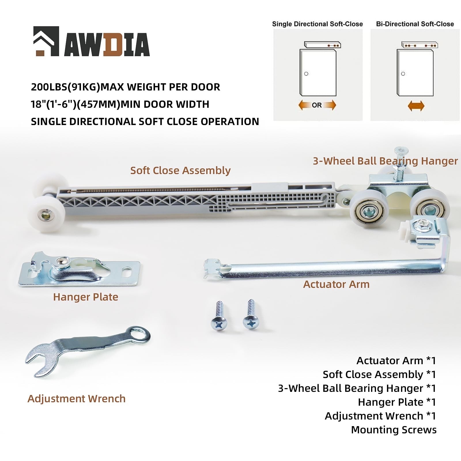 AWDIA Soft Close Pocket Door Hardware, 3-Wheel Soft Close Hangers with Stainless Steel Bearings for Sliding Pocket Door Frame Kit, single direction soft-close Pocket Door Soft Close Kit is for Single Direction Hidden Sliding Door Hardware Operation. Pocket Door Kit is Durable for 200lbs [91kg] Max Door Weight. Soft Close is Fit for 2x4 Or 2x6 Interior Wall Construction. Soft Close Pocket Door Hardware is Compatible for 1500, 1560, 1562, 2710 Series Pocket Door Frame. Package Include Actuator Arm *1, Soft Close Assembly *1, 3-Wheel Ball Bearing Hanger *1, Hanger Plate *1, Adjustment Wrench *1, Mounting Screws. If You Want to Creat 3-Wheel Ball Bearing Soft Close and Soft Open Pocket Door System, Please Add Quantity 2 on the Cart to Check Out.