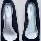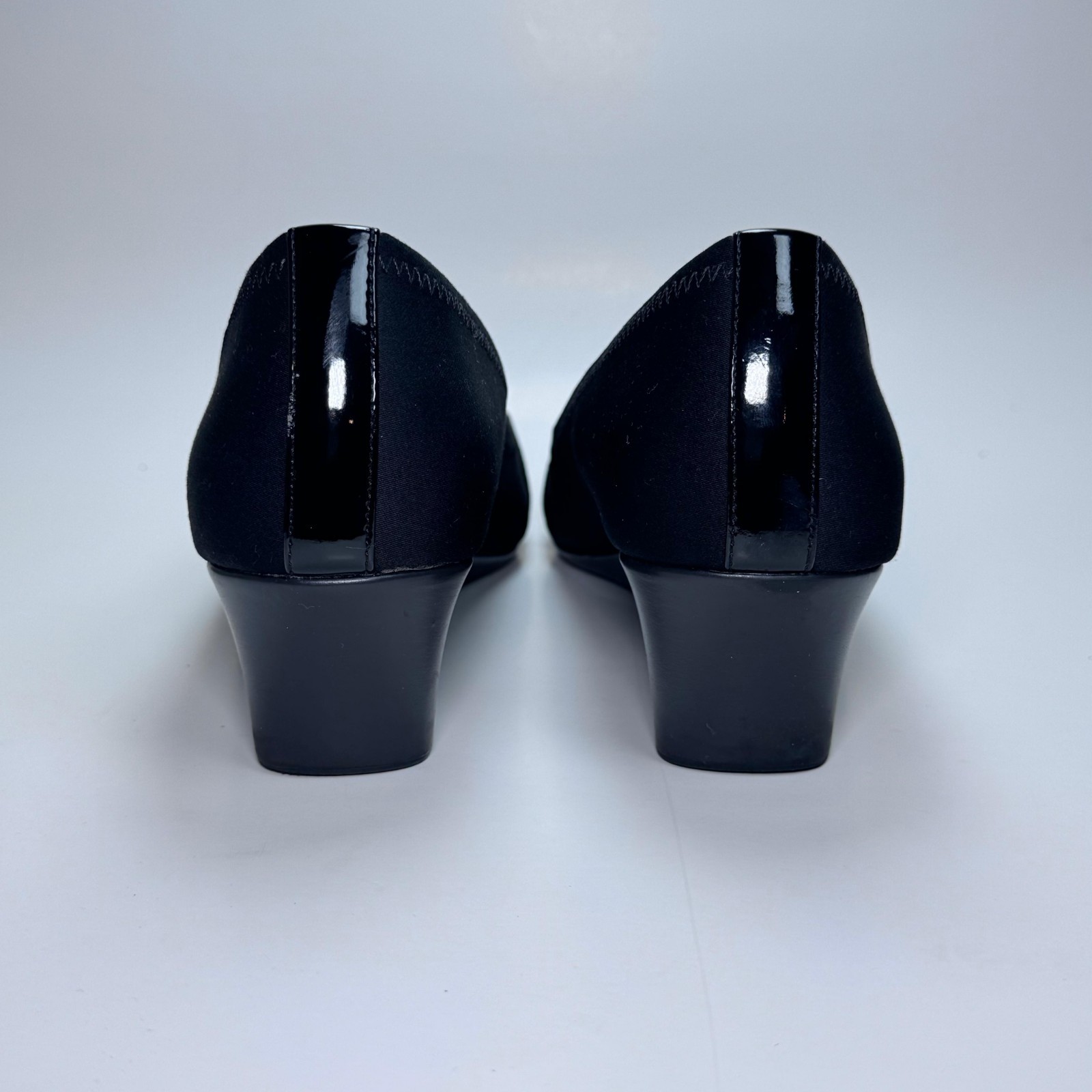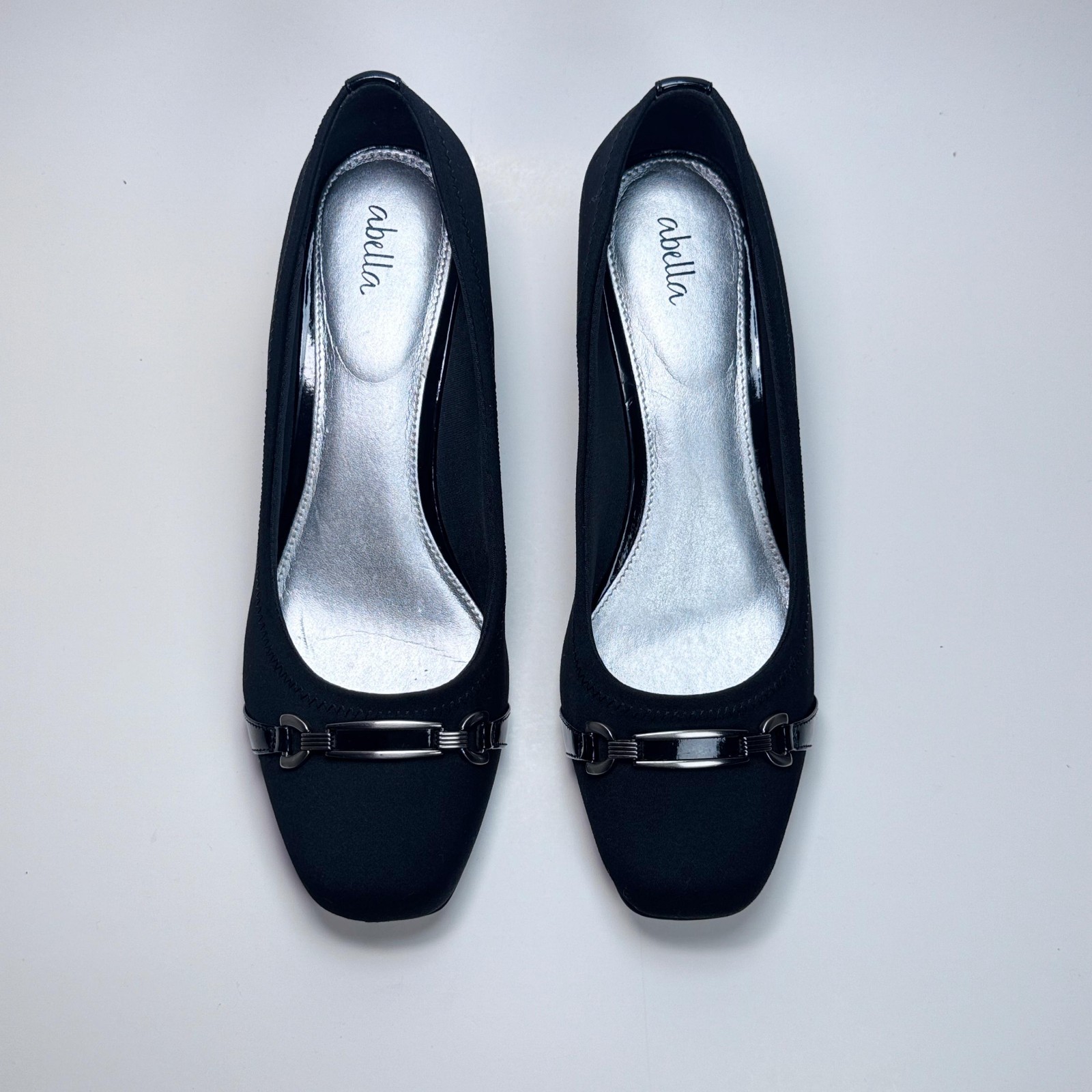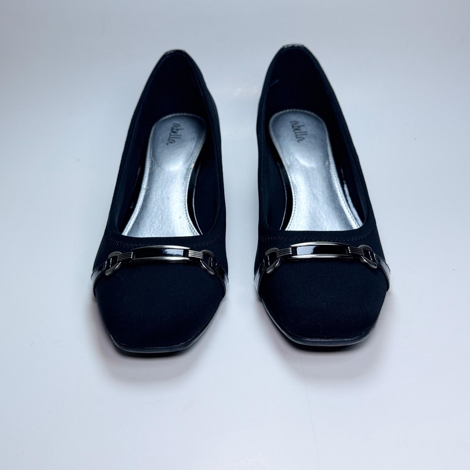 Elegant black Abella comfort wedges featuring a soft fabric upper and silver-tone hardware accent on the toe. Slip-on design with a modest wedge heel and cushioned insole for all-day comfort. • Size: Women’s 9.5 US • Color: Black • Upper Material: Fabric • Balance: Man-made materials • Heel Type: Low wedge • Heel Height: Approx. 2 inches • Made in: Vietnam • Condition: Excellent pre-owned condition with minimal wear. • Light surface scuffs and slight dull area on the patent trim at the heel (see photos). • Soles show minimal use. • Clean and ready to wear. Perfect for office, church, or everyday wear. From a smoke-free home.
