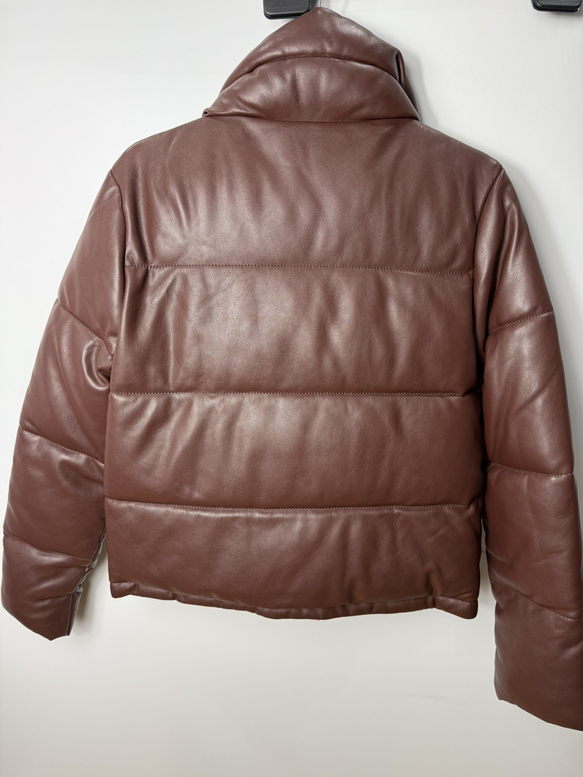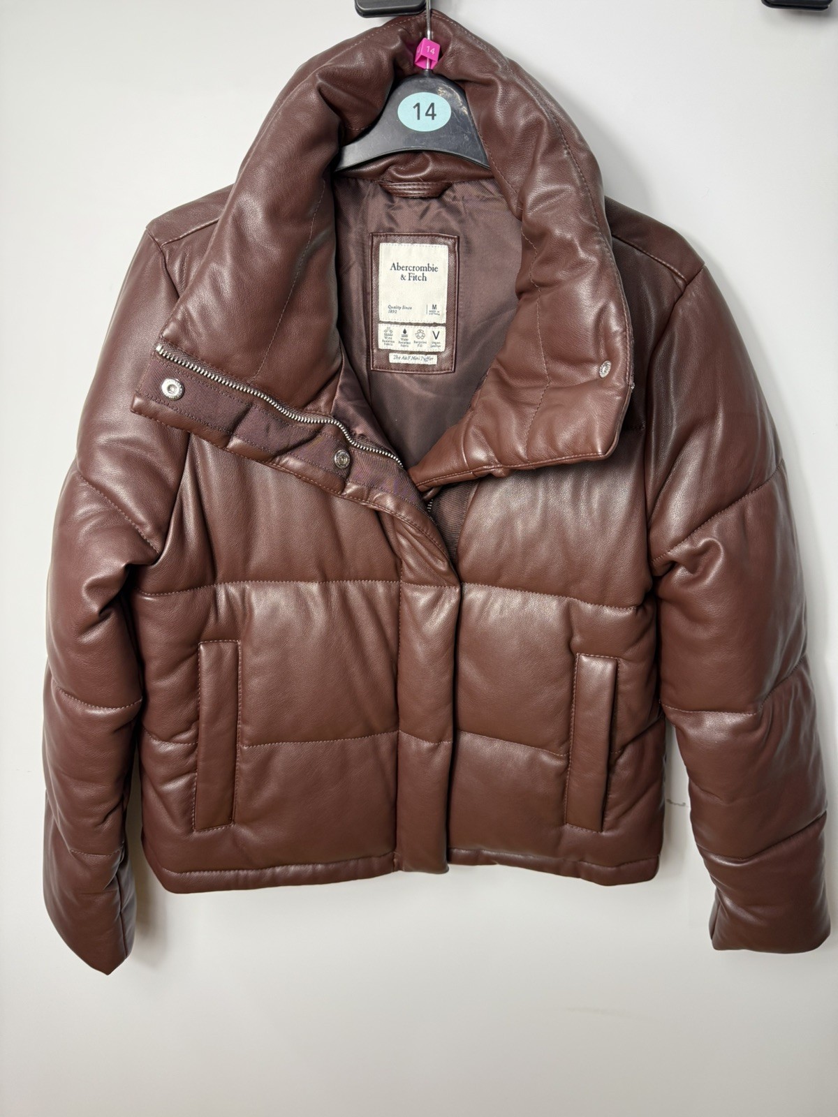 This Abercrombie & Fitch Chocolate Brown Faux Leather Mini Puffer Jacket in size M is a stylish and practical outerwear option for women. Made from polyester with a water-resistant feature, this short-length jacket is perfect for casual occasions in all seasons. The long sleeves and zip/snap closure ensure comfort and warmth, while the lightweight design adds a trendy touch. With a solid brown colour and a classic puffer style, this jacket from a reputable brand like Abercrombie & Fitch is a versatile and chic addition to any wardrobe.