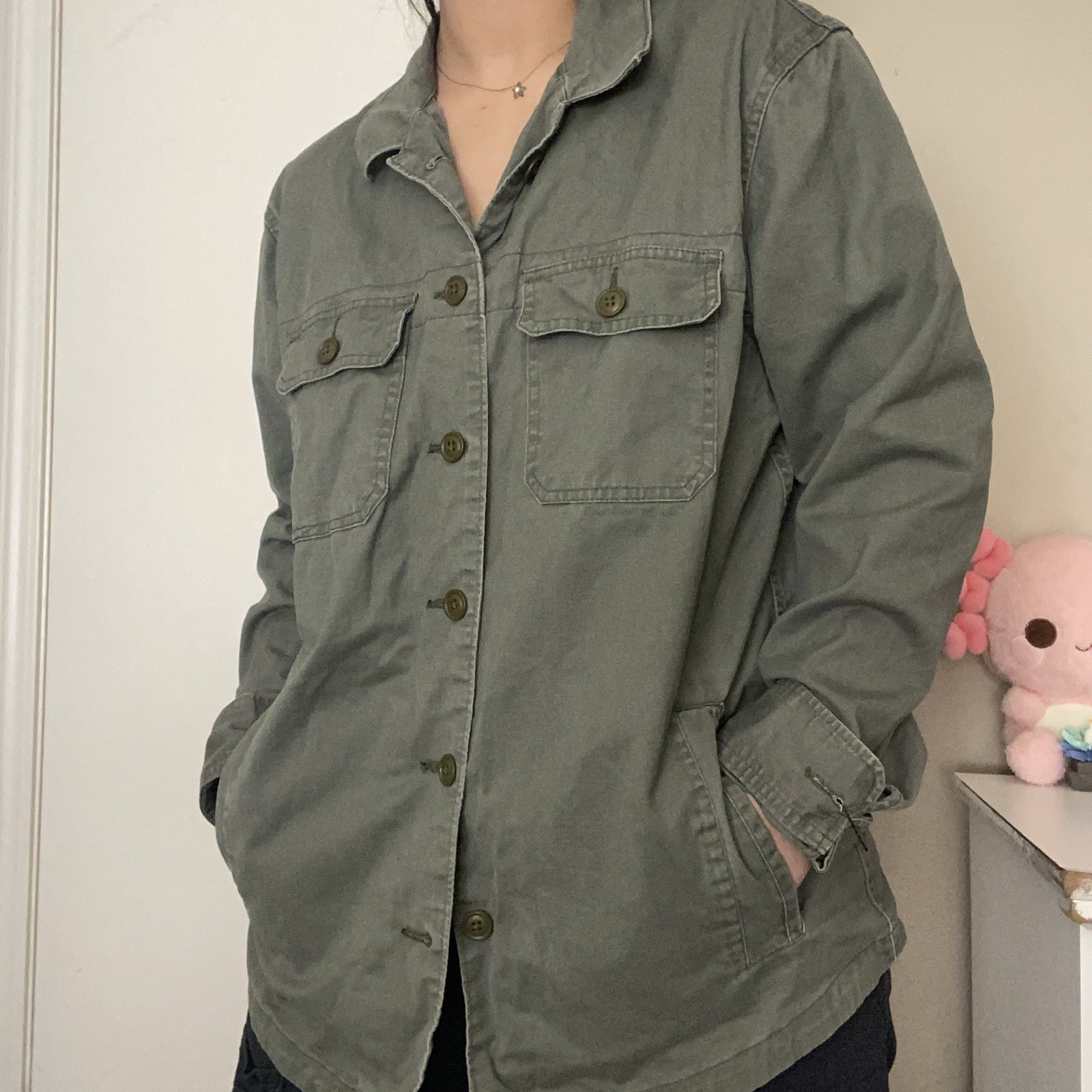 ☆ Item Description ☆ ☁︎ This olive green utility shirt jacket from Abercrombie & Fitch blends rugged structure with casual comfort. Featuring a button-down front, two flap chest pockets with button closures, and side hand pockets, it channels a laid-back military-inspired vibe. The lightweight cotton fabric makes it perfect for layering in transitional weather, while the slightly oversized fit adds a relaxed edge to any outfit. ☆ Features ☆ ❢ Style Profile: Abercrombie & Fitch Olive Utility Shirt Jacket ❢ Material: 100% Cotton ❢ Flaws: Button missing on right arm cuff :( ❢ Washing Instructions: Machine wash cold with like colors, only non-chlorine bleach, tumble dry low, warm iron if needed ☆ Size & Fit ☆ 𓆟 Size: XL 𓆝 Measurements available in photos (measured flat) ☆ Color ☆ ☁︎ Olive Green ☆ Shipping Info ☆ • Fast Shipping — packaged within 1–3 business days • All items freshly washed before shipping • ♡ Smoke-free home • ♡ Sustainable packaging used when available • ♡ Dog-friendly home • ♡ Freebies included :)