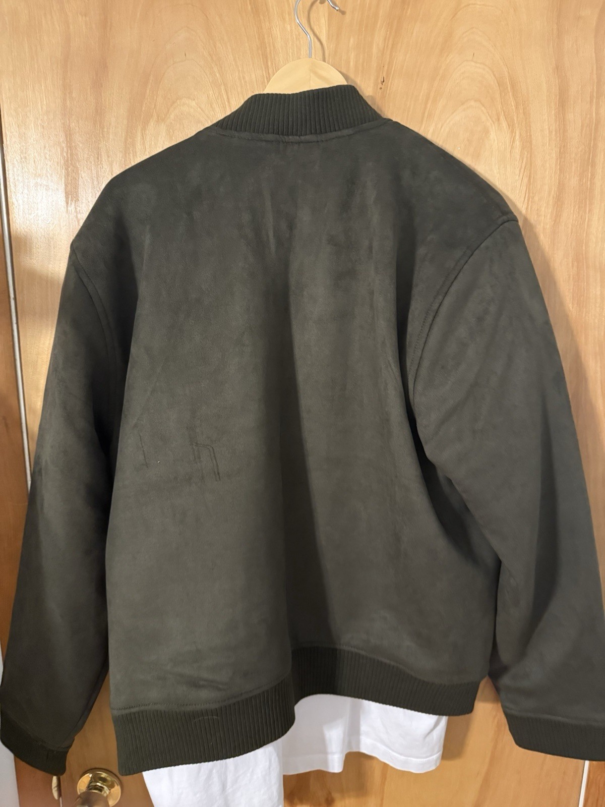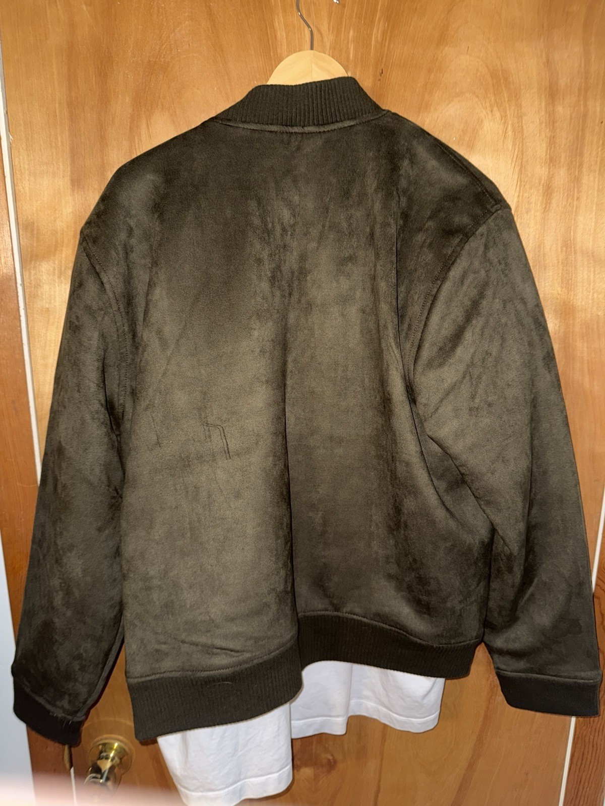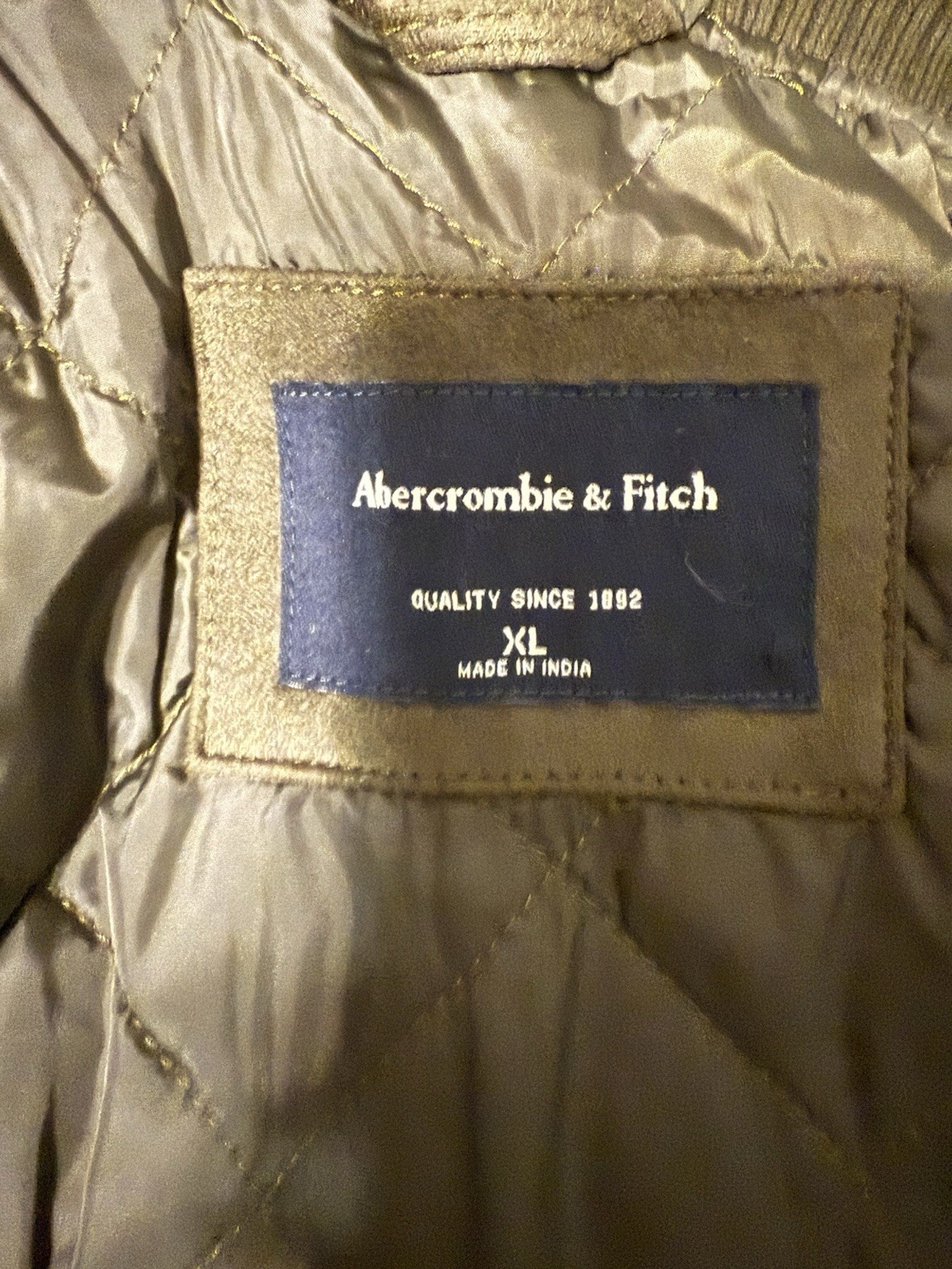 This Abercrombie bomber jacket blends modern streetwear style with timeless cold-weather functionality. Designed with a luxe faux suede outer in an olive green tone and a quilted inner lining for added warmth and comfort. • Size: XL • Color: Olive Green • Material: Faux suede outer / Quilted polyester lining • Fit: Standard bomber silhouette with ribbed cuffs, hem, and collar • Features: • Full zip front closure • Ribbed trim • Hand pockets • Quilted lining for extra warmth • Condition: Excellent pre-owned condition. No rips, stains, or noticeable wear. Clean and ready to ship. Perfect for layering during colder months. A versatile statement jacket with a premium look and feel.