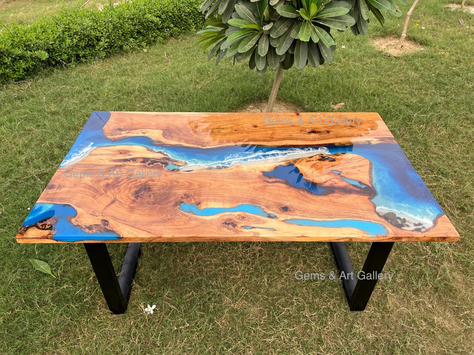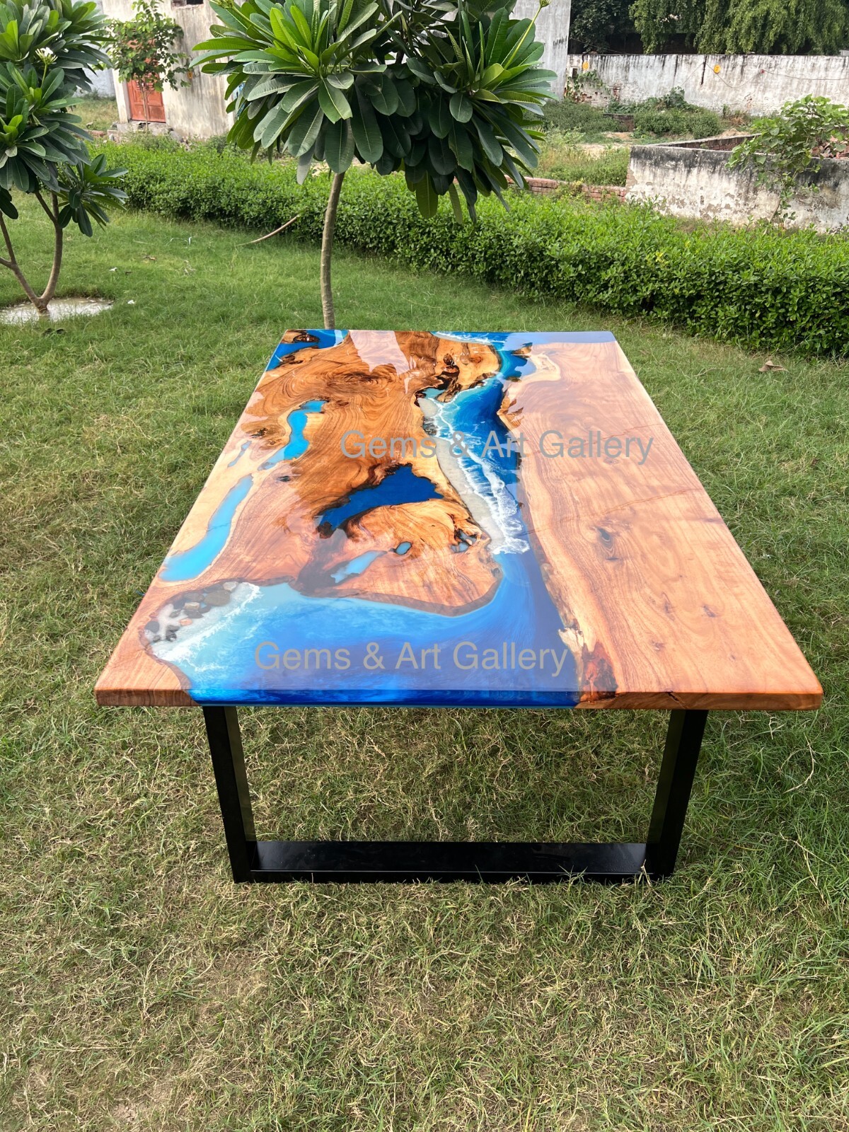 Acacia Wood Epoxy Table with Metal Legs (All our products are Made To Order and they can be customised in any design, shape, size and colour) Our dining and coffee epoxy resin tables are sure to add a unique touch to your interiors as they are entirely handmade with the best quality of wood and resin. You can choose from our wide variety or provide us with any design you want. When you order with us, our team will first provide you with a variety of wood slabs and colour options to choose from before we start making your table, so that you get exactly what you desire. The production process of our tables is just as mesmerising as the final product and to share this beautiful journey with you our team will constantly share pictures and videos of the production at each stage with you. The above mentioned prices do not include the custom duties of the destination country. During the production we send our customers an exclusive range of legs to choose from. At Gems & Art Gallery, we find inspiration in nature's craftsmanship. The product photos you see reflect items that have already been created and delivered. Since sourcing identical wood for two tables is quite rare, we strive to replicate the original design as closely as possible. Thankyou for giving us an opportunity to serve you. Feel free to contact us if you have any queries.