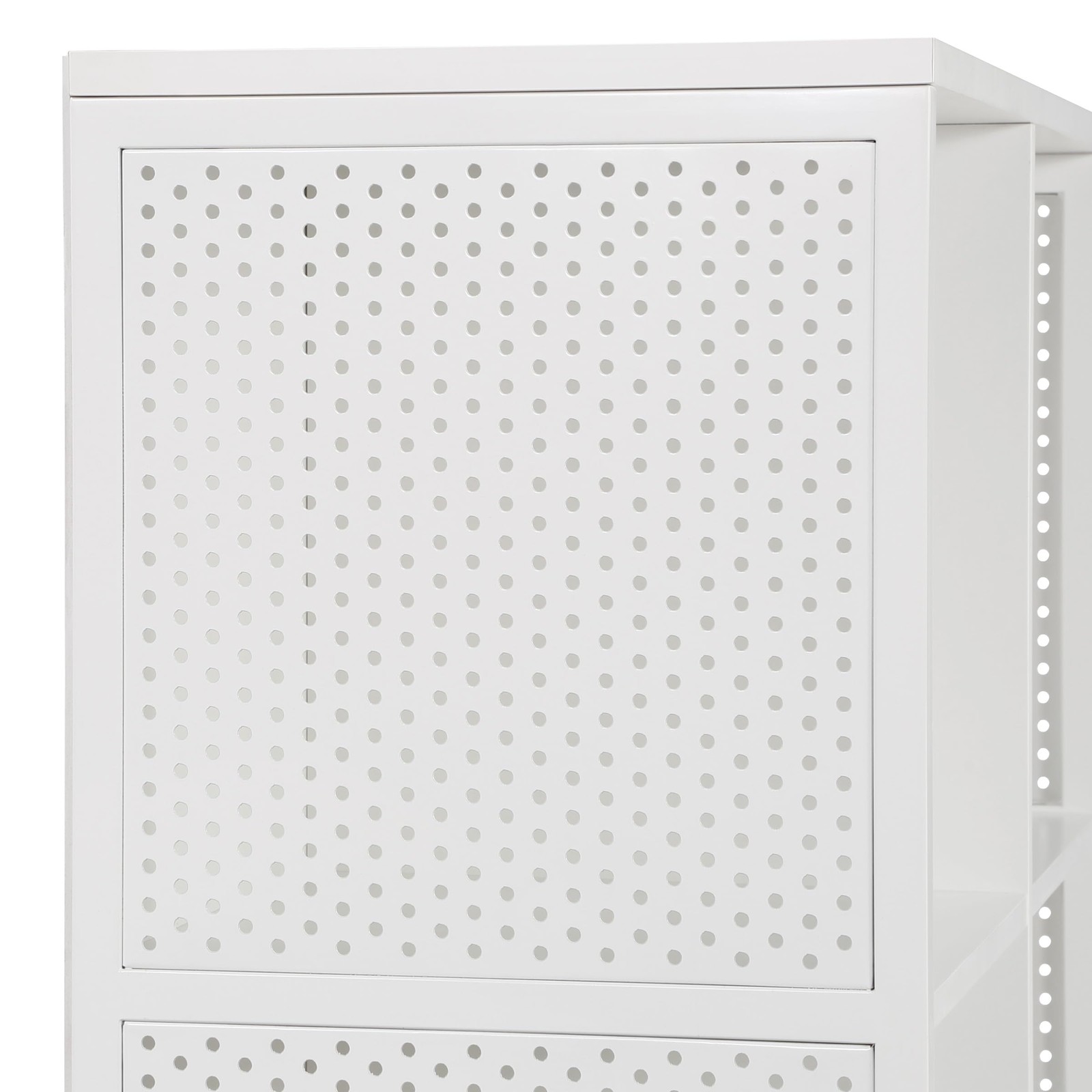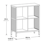 Solve your practical storage solution in style with our wood and metal storage bookshelf With 4, 13-inch x 13-inch cube shelves, this bookshelf is the perfect size for storing books, decorations, baskets or storage tubs. The woodgrain finish and perforated metal sides give it a modern industrial style and that will elevate any room and the sturdy metal frame with center support will add long-lasting durability and strength. Dimensions 29-inchess wide x 13.5-inchess deep x 34-inches high Assembly is a breeze with the easy cam-lock system, so you can have your new bookshelf up and running in no time.