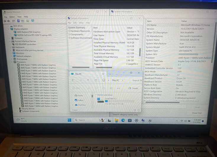 Acer laptop SFX14-41G nvidia 3050 Ti ryzen 7 windows 11 home local admin account 480 ssd 16gb ram wifi 6, hdmi, usb 3.2 14ips uses 19v 4.74a power supply not included but can also charge off usbc See less