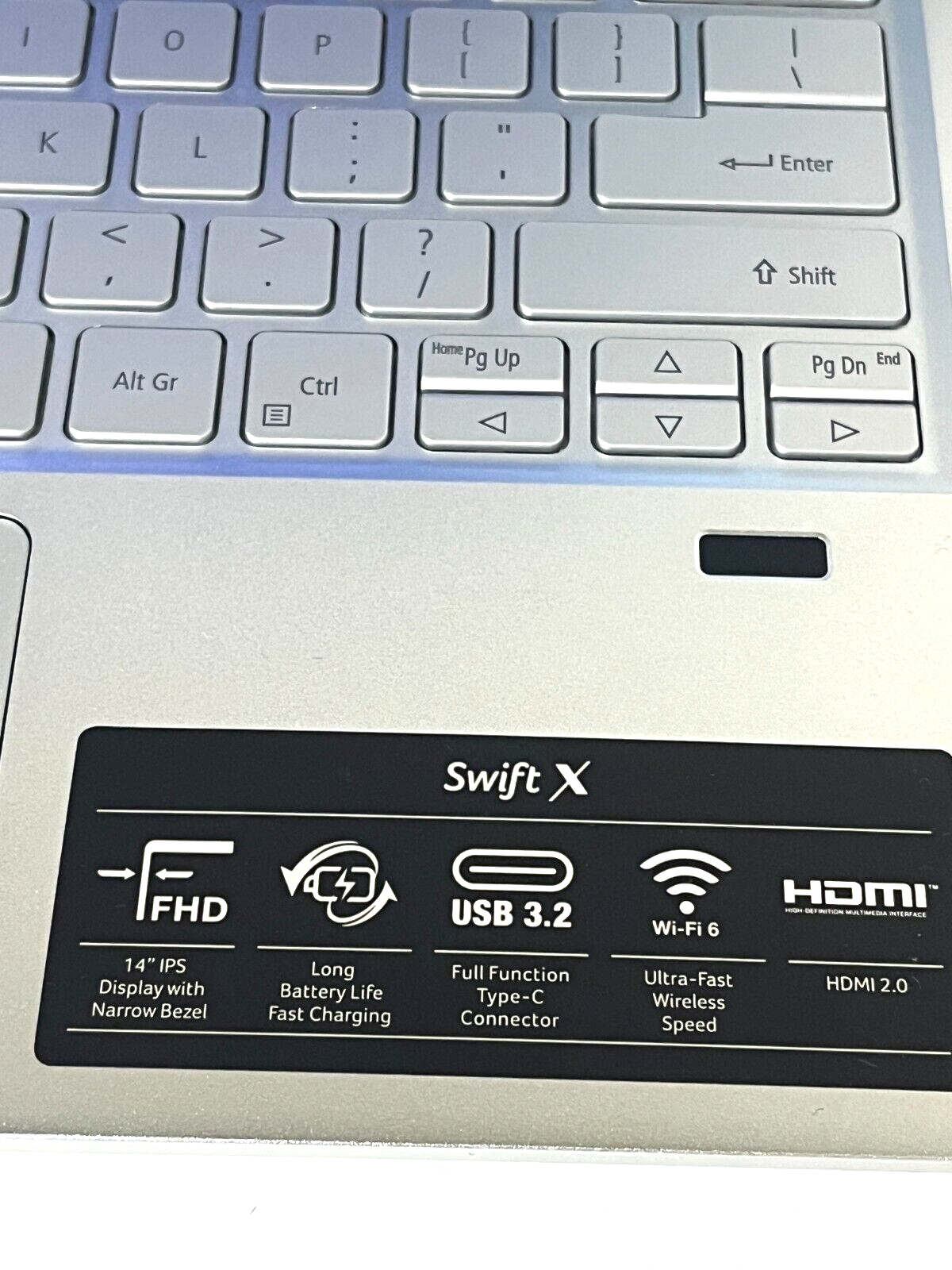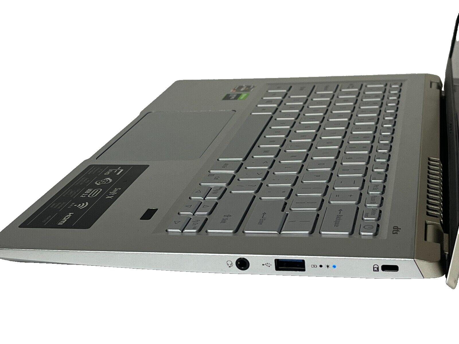 Operating System Operating System Windows 11 Home Operating System Architecture 64-bit Processor Processor Manufacturer AMD Processor Type Ryzen 7 Processor Model 5700U Processor Speed 1.80 GHz Processor Core Octa-core (8 Core™) Display & Graphics Graphics Controller Manufacturer NVIDIA® Graphics Controller Model GeForce® GTX 1650 Graphics Memory Capacity 4 GB Graphics Memory Technology GDDR6 Graphics Memory Accessibility Dedicated Screen Size 14" Display Screen Type LCD Display Screen Technology In-plane Switching (IPS) Technology ComfyView Backlight Technology LED Screen Resolution 1920 x 1080 Aspect Ratio 16:9 Memory Total Installed System Memory 16 GB System Memory Technology LPDDR4X Memory Card Reader No Storage Total Solid State Drive Capacity 512 GB Solid State Drive Interface PCI Express Optical Drive Type No Network & Communication Wireless LAN Standard IEEE 802.11 a/b/g/n/ac/ax Built-in Devices Microphone Yes Finger Print Reader Yes Number of Speakers 2 Sound Mode Stereo Interfaces/Ports HDMI Yes Number of HDMI Outputs 1 Number of USB 3.2 Gen 1 Type-A Ports 2 Number of USB 3.2 Gen 2 Type-C Ports 1 Total Number of USB Ports 3 USB Type-C Yes USB Type-C Detail USB Type-C port: USB 3.2 Gen 2 (up to 10 Gbps), DisplayPort over USB-C, USB charging 5 V; 3 A, DC-in port 19 V; 65 W Input Devices Pointing Device Type TouchPad Keyboard Yes Keyboard Backlight Yes TouchPad Features Multi-touch Gesture Battery Information Number of Cells 4-cell Battery Chemistry Lithium Ion (Li-Ion) Maximum Battery Run Time 14 Hours Battery Energy 59 Wh Power Description Maximum Power Supply Wattage 90 W Physical Characteristics Height 17.90 mm Width 322.8 mm Depth 212.2 mm Weight (Approximate) 1.39 kg Product Color Gold Miscellaneous Package Contents Swift X SFX14-41G-R9AH Notebook Lithium Ion Battery AC Adapter Security Features Kensington Lock Slot BIOS Passwords: User Supervisor