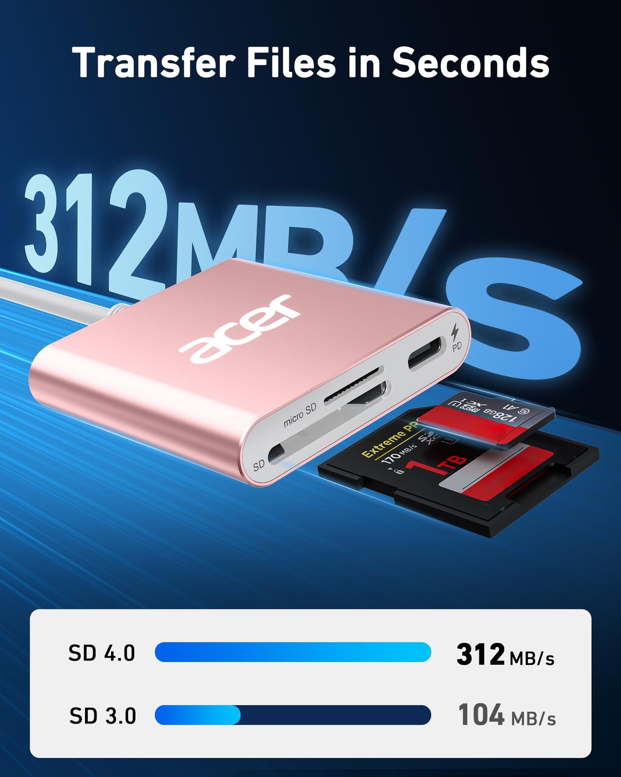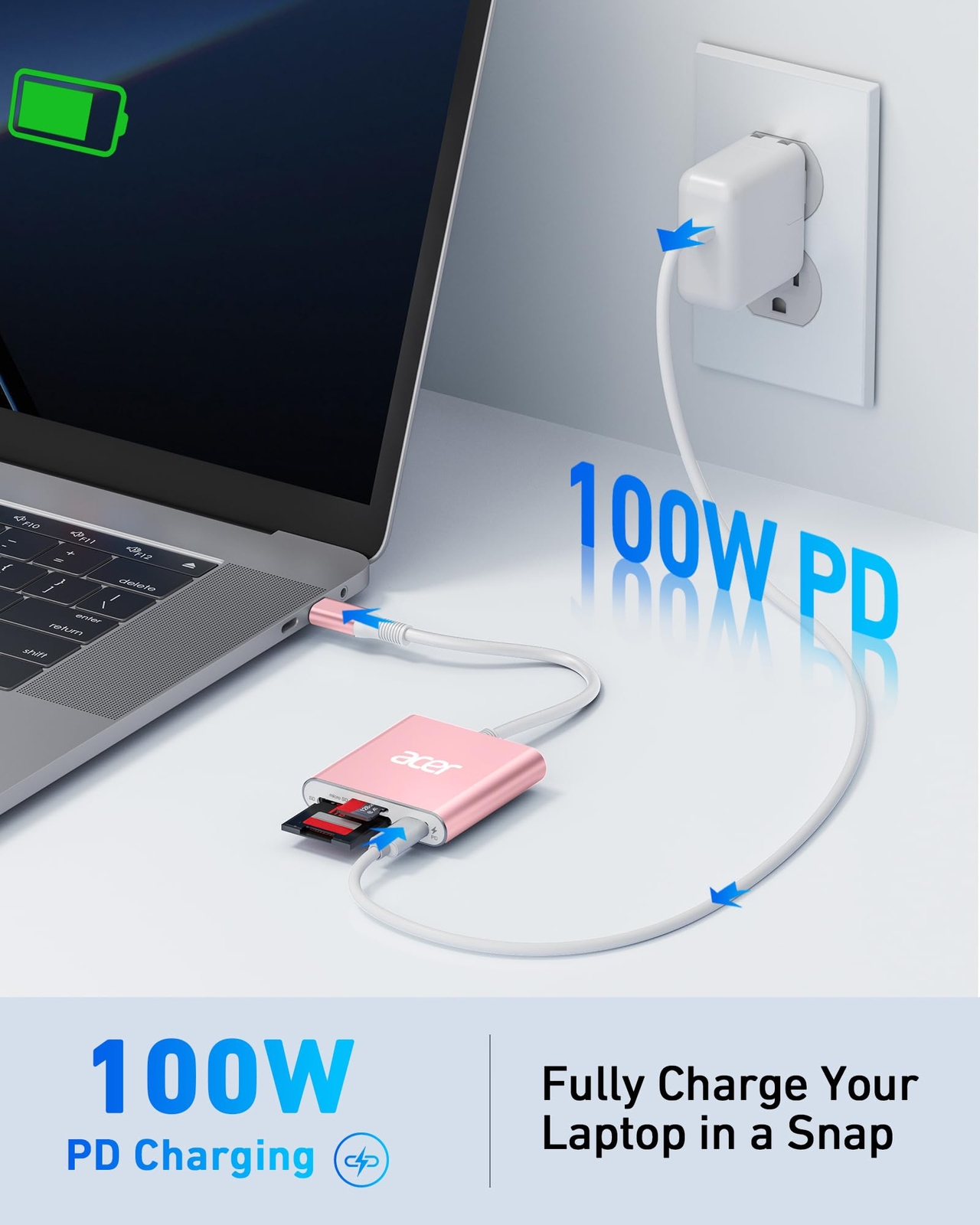 Acer UHS-II USB C SD Card Reader with 100W PD Port, 3-in-1 Type-C SD 4.0 Memory Card Reader Adapter for MicroSD SDXC SDHC MMC RS-MMC UHS-II & UHS-I Cards for iPhone 15, Macbook, Tablet, Cameras (Pink) High-Speed Data Transfer: The Acer USB C SD Card Reader supports the latest UHS-II memory cards, delivering blazing speeds of up to 312MB/s. Enjoy data transfers three times faster than ordinary UHS-I card readers, perfect for 4K movies, high-resolution photos, and video Vlogs. Read & Write 2 Cards Simultaneously: Say goodbye to cumbersome file transfers. This USB C Micro SD Card Reader allows you to read and write data on two cards simultaneously, enabling seamless sync, transfer, and copying between your cards without the hassle of constant plugging and unplugging. USB C 100W Fast Powerful Charging: Tailored for rapid charging, the Type C port on this Type-C SD Card Reader has a maximum power delivery of 100W and is compatible with PD fast charging protocols. Dedicated solely to charging, this port ensures efficient and stable power support for your devices without engaging in data transfer. The Acer SD 4.0 Memory Card Reader is compatible with a wide range of devices, including laptops, tablets, iPhone 15/15 Pro, MacBook Air/Pro, iPad Air/Pro, and Android smartphones. Plug in the card reader and your memory cards to easily share your moments. (Note: Android phones require OTG support). Durable & Portable: Crafted with a sturdy aluminum alloy case and a 0.66ft cable, this Micro SD Card Reader combines portability with durability. Unlike ordinary card readers with plastic cases, it offers a sleek appearance and enhanced durability, ensuring long-lasting performance you can rely on. What You Get: Acer USB C SD/MicroSD Card Reader and a user manual. Plus, enjoy 24/7 customer service and a hassle-free 12-month warranty. High-Speed Data Transfer: The Acer USB C SD Card Reader supports the latest UHS-II memory cards, delivering blazing speeds of up to 312MB/s. Enjoy data transfers three times faster than ordinary UHS-I card readers, perfect for 4K movies, high-resolution photos, and video Vlogs. Read & Write 2 Cards Simultaneously: Say goodbye to cumbersome file transfers. This USB C Micro SD Card Reader allows you to read and write data on two cards simultaneously, enabling seamless sync, transfer, and copying between your cards without the hassle of constant plugging and unplugging. USB C 100W Fast Powerful Charging: Tailored for rapid charging, the Type C port on this Type-C SD Card Reader has a maximum power delivery of 100W and is compatible with PD fast charging protocols. Dedicated solely to charging, this port ensures efficient and stable power support for your devices without engaging in data transfer. The Acer SD 4.0 Memory Card Reader is compatible with a wide range of devices, including laptops, tablets, iPhone 15/15 Pro, MacBook Air/Pro, iPad Air/Pro, and Android smartphones. Plug in the card reader and your memory cards to easily share your moments. (Note: Android phones require OTG support). Durable & Portable: Crafted with a sturdy aluminum alloy case and a 0.66ft cable, this Micro SD Card Reader combines portability with durability. Unlike ordinary card readers with plastic cases, it offers a sleek appearance and enhanced durability, ensuring long-lasting performance you can rely on. What You Get: Acer USB C SD/MicroSD Card Reader and a user manual. Plus, enjoy 24/7 customer service and a hassle-free 12-month warranty. Shipping from the USA All of our products are shipped from the USA, ensuring quick delivery to your destination. Payment We offer the following payment methods: PayPal, credit card, bank transfer, and eBay's secure payment system. Free Shipping & Free Returns Shipping within the USA is FREE. Additionally, any return is absolutely free for you. Risk-Free Purchase You have the option to return an item within 30 days without any justification. We cover the return shipping costs! Fast Shipping We ship immediately upon receipt of payment. Generally, the package is delivered within 2-3 days in the USA. If it takes longer, we will contact you. Quality and Costs Made in Europe, USA, China No customs fees or additional charges Total satisfaction guarantee Invoice with declared VAT available upon request in .pdf format Feedback Your feedback is very important to us. After you pay for your purchase, you will automatically receive positive feedback from us.