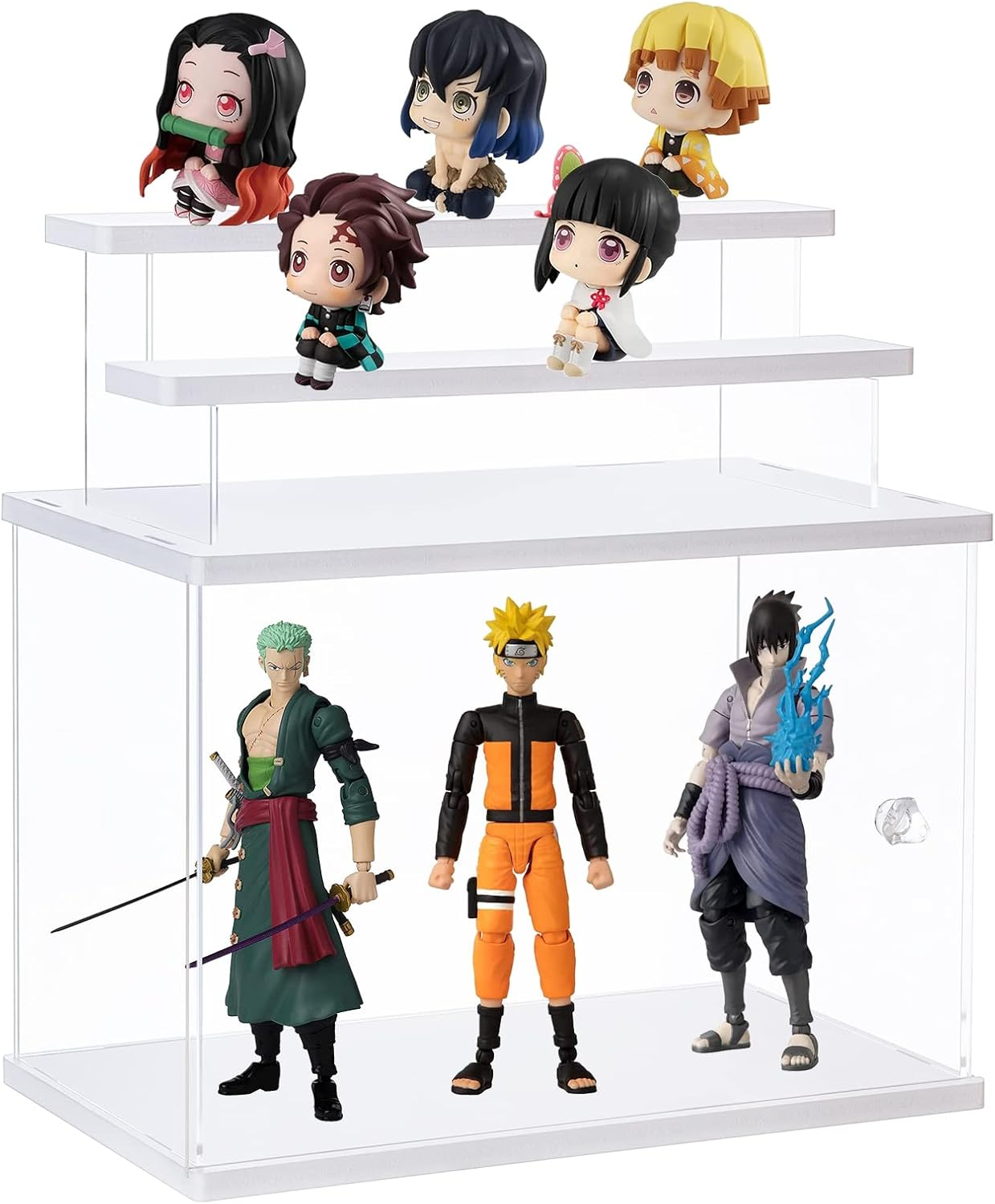 【Material & Dimension】Overall: 12.4 x 8.6 x 7 inches The display case is made of premium acrylic and chevron board. With double layers of protective film on the surface to protect the acrylic board from dust. 【Multi-Use】The display box is perfect for collectibles including personalized jewelry, handmake artist, car models, lego models, figurines, funko pop, action figures collection and display 【High transparency】The clear display case adopt premium and transparent acrylic material. Make the display effect artistic and beautiful. A pair of disposable gloves and clean cloth are provided to prevent dust and fingerprints. 【Removable Double Ladder design】This display case bottom and top side is white, 4-sided transparent design that makes the content visible, Inside equipped with a removable double-layer ladder, can be use it with ladder or without ladder. 【Easy to Assemble】Please remove the protective film before assembly. Just need to connect the sides, bottom and top, only takes few minutes to assemble, no tools needed. Product Description Acrylic Display Case for Collectibles The clear display case is a great showcase for your collections. it will protect your favorite and valuable collectibles form scratches, dust and other damages. Store and display your favorite collectibles such as funko pop, action figures, artifacts, dolls, cars models, airplanes models, small logo models, miniature figurines and so on. The transparent display box and white shelves can display and organize what you want with a modern look and matched well with any kinds of décors. Can be used at home, in retail stores, museums, or trade shows. Sliding Door Design The sliding door design is convenient for you to put in your favorite collectibles or take out and replace new collections. Removable Double Ladder This display case is equipped with a removable double-layer ladder, can be use it with ladder or without ladder. You can put it on the top of the box or inside of it. Package Include: 6x Clear Acrylic Board 4x White Chevron Board 1 Pair of Glove 1x Microfiber Cleaning Cloth 1x User Manual Easy to Assemble Following the provided instructions, you can assemble the display case within few minutes. Notes : The double layer protective films must be torn off from the acrylic surfaces (both sides) before assembly.