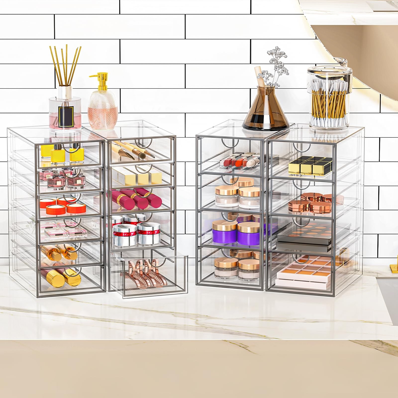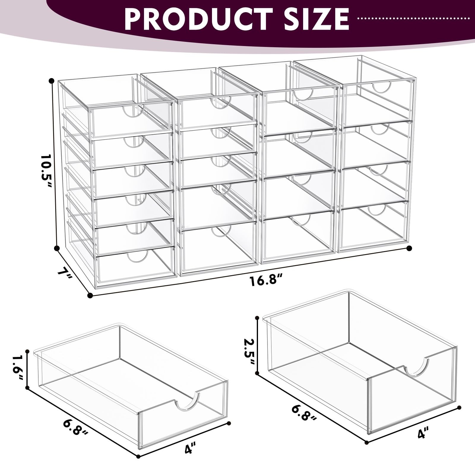 4 Pack makeup organizer with 19 Drawers: Our Acrylic makeup bathroom organizer can maximize space on shelves, dressers ,under the sink, and bathroom counters. There are 19 drawers in total, it’s perfect to organize all your messy items into section, and very easy to take. You can also use them side by side, put your small objects on top of acrylic bins to make your countertop space more tidy. And 4 Pack storage bins with 19 drawers are also enough for you to place in multiple places, very good value. Dustproof and High Quality: This clear Acrylic storage drawer is dust proof and waterproof, and can protect the items we put away from dust and water. In addition, the desk organizer is made of shatterproof plastic. The sturdy, transparent and fashionable design is with decoration of any rooms. PLEASE DO NOT PUT IN DISHWASHER. Easily clean with soap and warm water. Display & Beautifully: Large capacity makeup storage organizer suits lipstick, mascara, foundation, bronzer, blushes, eyeshadow, nail polish- Can also be used to jewelry, personal accessories, grooming tools, keepsakes. And this drawer organizer can also accommodate all office supply accessories, such as pen, pencil, marker, ruler, eraser, paper clip, scissors, and so on - Fits on most dressers, desk, bathroom vanity desks, and counter tops, saving space on your dresser. Multi-Purpose Organizers: Our storage drawers help you to organize everywhere in your home, they can be used as organizers and storage for makeup, essential oils or nail polishes , it can be used to organize small toiletry items on bathroom countertop, it can be used to children's hair ribbons or jewelry, it can be used to family medicine, ect. You can flexibly use our storage organizer for house organization and storage according to your needs. Unique Design: The clear style of 4 pieces of large capacity sorting and storage creates easy visibility and attractive display. It is perfectly matched with most décor - Makeup case is a great choice for any girl, teen, adult, beauty, fashion and makeup lover. Outer dimensions: 16.52'' W x 9.84'' H x 7'' L.