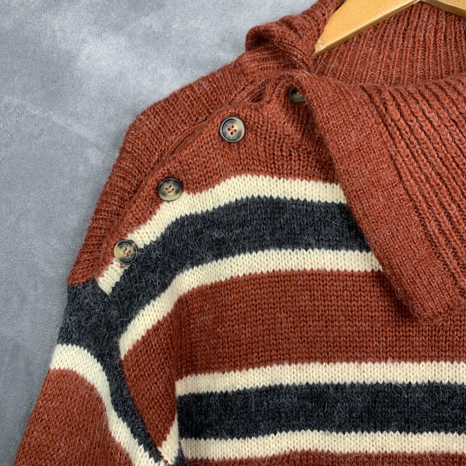 This is a versatile Item & Thread Acrylic Mock Neck Pullover Top Blouse Sweatshirt in size L. The top features a solid pattern with a mock neck and long sleeves, making it suitable for various occasions such as travel, parties, casual outings, or workwear. The pullover closure and classic fit provide comfort and ease of wear. Made of acrylic material, this multicolor blouse with button accents is machine washable and suitable for all seasons, particularly winter, fall, and spring. Ideal for women looking for a basic yet stylish addition to their wardrobe.