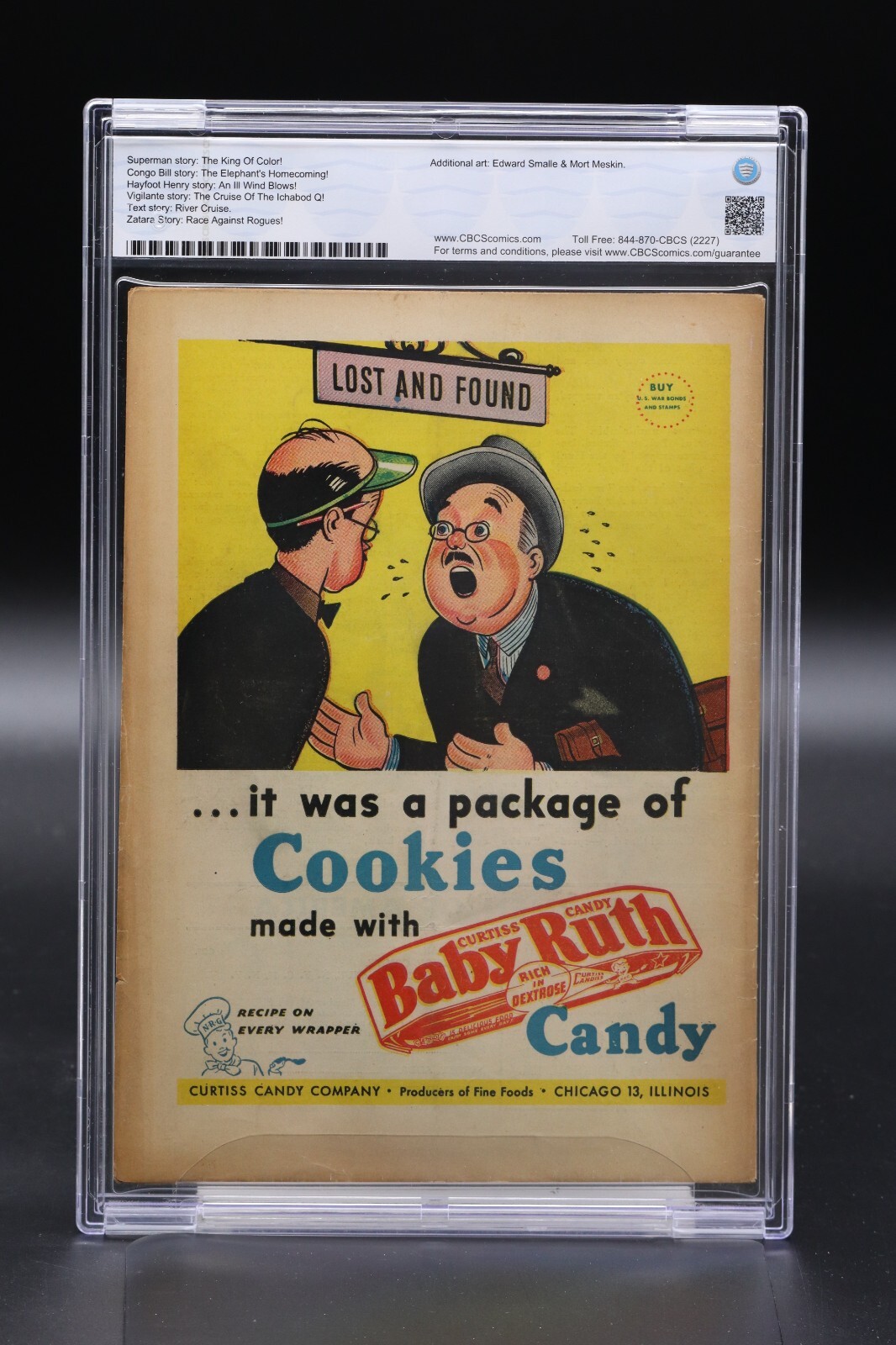 Link to our BEST items!! Link to our ENDING items!! Link to our FAQ page !! Link to our NEWEST items!! Item: Action Comics (1938) #89 Wayne Boring Rainbow Cover CBCS 6.5 Blue Label OW Pages Special Notes: This issue is a First Printing! We do not use stock photos! What you see in the pictures is what you will be getting. Publication Date: Oct 1945 (The date in the title refers to the year the title started) Writer: Al Schwartz Interior Artist: Ira Yarbrough Cover Artist: Wayne Boring Condition: CBCS 6.5 Fine + Page Quality: Off-White Pages Bar Code: 0000175-AC-002 SHIPPING: All pricing is based on the weight of the package and your location. Package Weight: 3lbs Package Size: 14x12x6 We charge exact shipping costs per USPS with NO handling charge. You can check our shipping quotes on the USPS website. For the convenience of the winner, we offer shipment via Priority Mail or Media Mail, when shipping to an address inside the USA. For International Winners, we offer Priority Mail International or First-Class International Mail. Please click on the "SHIPMENTS and PAYMENTS" tab above for more details. * FREE Insurance, for items totaling under $100.00, is only available when shipping with USPS Priority to an address within in the USA! All packages will have a tracking number sent to the winner! Shipping & Payment Terms: If you would like to have your item insured, please contact us and we will send you an invoice with the adjusted shipping charges. We will be happy to combine the shipping charge for multiple auction wins . If you win a single item, you do not have to wait for an invoice to make your payment. IF YOU WIN MULTIPLE AUCTIONS, PLEASE WAIT UNTIL WE SEND YOU A COMBINED INVOICE BEFORE PAYING FOR YOUR ITEMS. Please DO NOT pay for items separately. We will ship your items within 2 business days upon receiving your payment. Payment Options: PayPal is the preferred method of payment per eBay's policies. If you do not have a PayPal account, we do accept credit card payments over the phone. Payment MUST be received within 7 business days of the auction ending or your bid will be cancelled and eBay will be contacted. Questions: We will be happy to answer any questions you have about our items before the auction ends. Please ask your questions as early as possible so we have plenty of time to answer them. Return Policy: All returns MUST be approved by Duncanville Bookstore. If there is a problem with your order, please give us a chance to address the issue before you leave negative feedback and/or contact PayPal for a refund. Store Info: Please check our other auctions and our eBay store for more great deals!! Check out our info page for more great ways to get in touch with us. Also, feel free to contact us if you are looking for anything in particular or you are looking to sell your items. We are always buying!! Duncanville Bookstore is open 7 Days a Week 10am-7pm CST!!