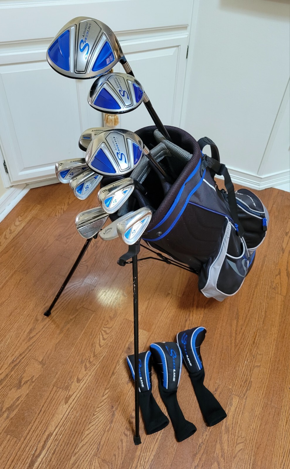 Overall good condition. This set includes Adams Speedline Driver, 3 wood, 5 wood, 5 hybrid, 6,7,8,9,SW, Callaway putter, matching stand golf bag. No pitching wedge. The driver has 2 dents on the top of the club but does not affect the performance. Right handed. Graphite Shafts for driver, woods and hybrid. Steel shafts for irons and putter. Good grips on all clubs. Please review each picture thoroughly. You will receive the exact golf set pictured. Shipped fast with tracking using UPS ground or FedEx. Only shipped to mainland US (48 states). No p.o. boxes. Thanks for shopping!