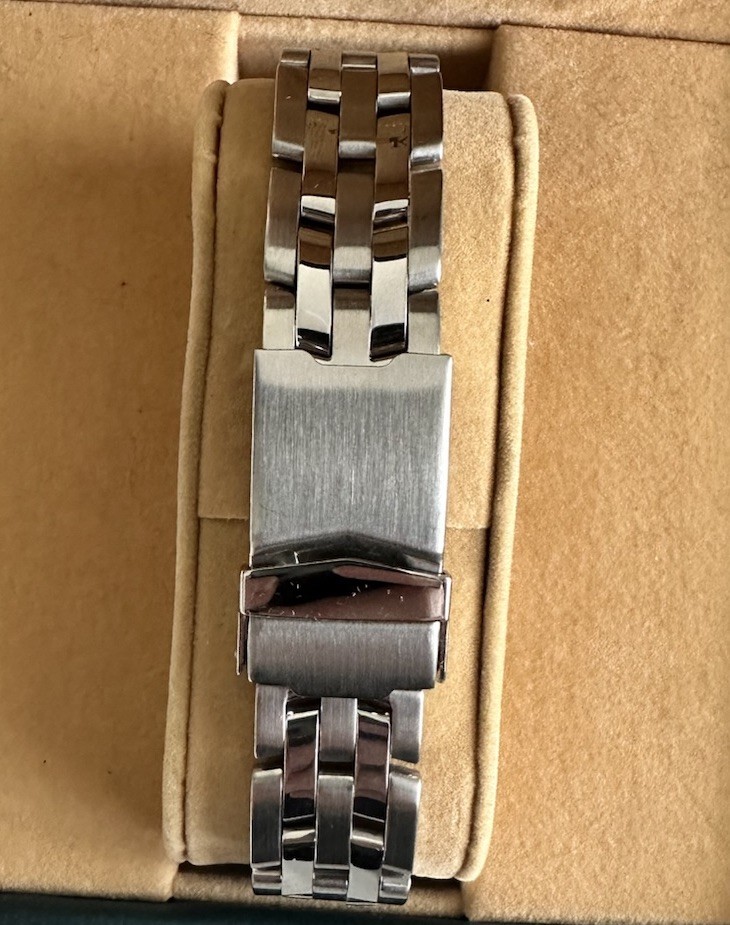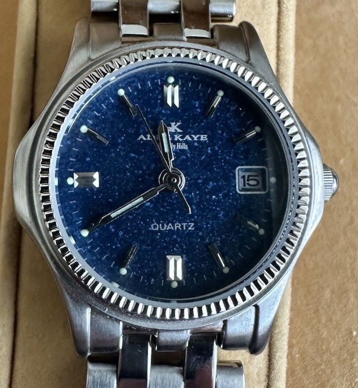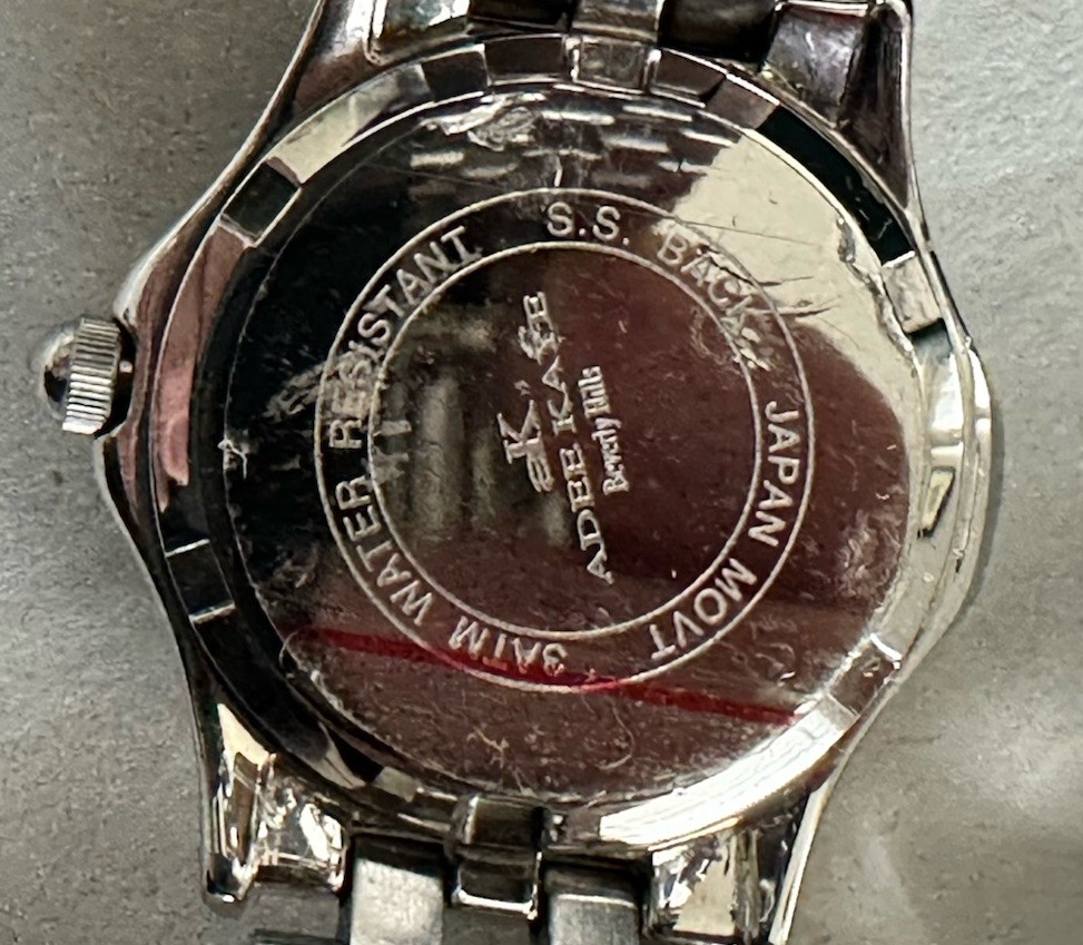 The Adee Kaye Women's 38mm Blue Dial Date Quartz SS Watch is a stylish and functional timepiece suitable for everyday wear. This watch features a silver stainless steel case and bracelet, with a beautiful blue dial and baton indexes. It is water-resistant up to 50 meters and has a date indicator for added convenience. The 12-hour dial and screwback caseback add to the overall design of this elegant watch. With its 38mm case size and sleek round watch shape, this Adee Kaye watch is a must-have for any woman looking for a fashionable accessory. It comes with an original box and new battery, making it a great choice for any occasion. This watch is in good condition with a new battery and keeps time well. There are some minimal scuffs and scratches to the back of the case only. See All Photos. Watch is sold as is.