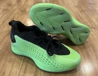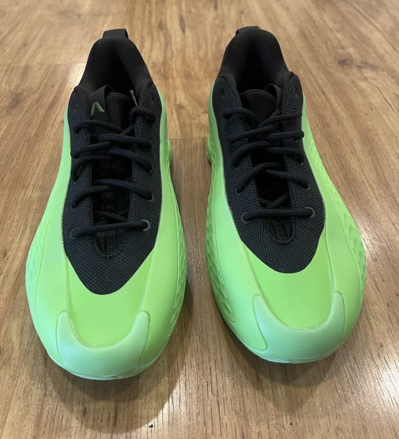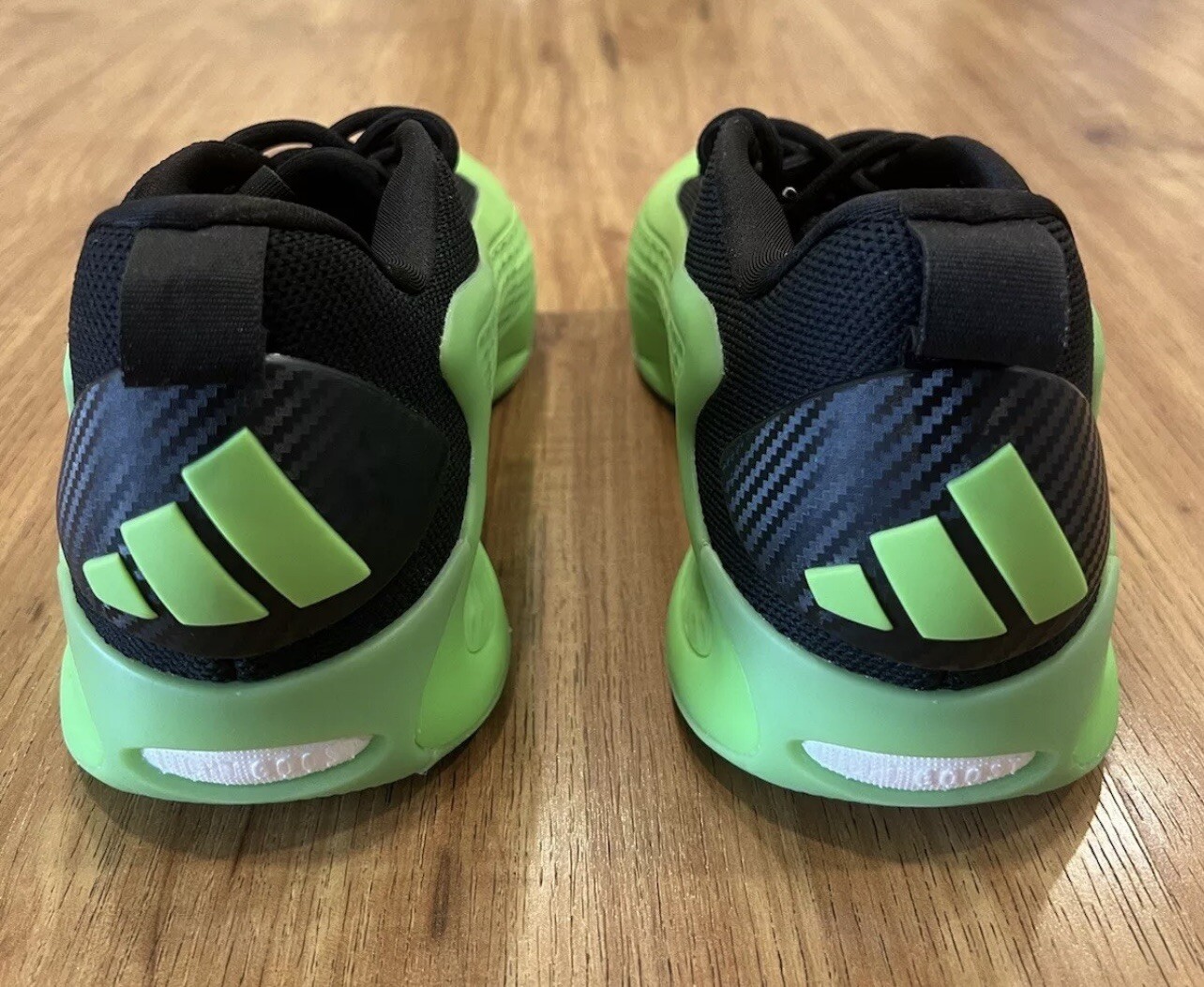 The Adidas A.E. 1 Low Slime sneakers in a men's size 7.5 feature a green colorblock design with reflective details and the signature of basketball player Anthony Edwards. These lace-up sneakers are part of the Adidas Anthony Edwards product line, designed for performance and breathability with a cushioned and lightweight construction. The silhouette is a low-top style with a TPU upper material, rubber outsole, and foam insole, making them suitable for activewear or casual wear during the summer, fall, or spring seasons.
