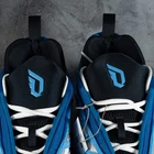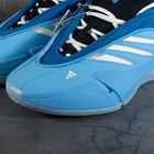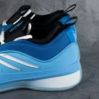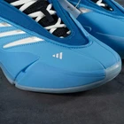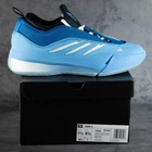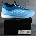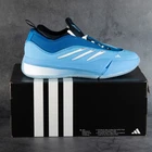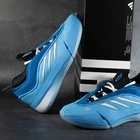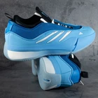 The product is a pair of Adidas Dame 9 basketball sneakers in a blue and white color scheme. These athletic sneakers feature a low top design with a lace-up closure and synthetic lining for comfort. Manufactured in 2025 in China, these sneakers are part of the Adidas Dame product line and are designed specifically for basketball performance. The shoes are new in the box and include features such as a solid pattern, athletic style, and the iconic Adidas branding.