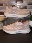 The Adidas Duramo 10 Wide Running Shoes in Almost Pink Wonder Mauve are designed for women in US shoe size 6.5 (UK size 4.5). These sneakers feature a lace-up closure, low-top shoe shaft style, and a breathable mesh upper material with a rubber outsole. The shoe is part of the Adidas Duramo product line, known for its comfort, cushioning, and durability, making it suitable for activities like walking, running, and cross-training. The design includes colorful accents and the Adidas logo, adding a stylish touch to the athletic footwear.