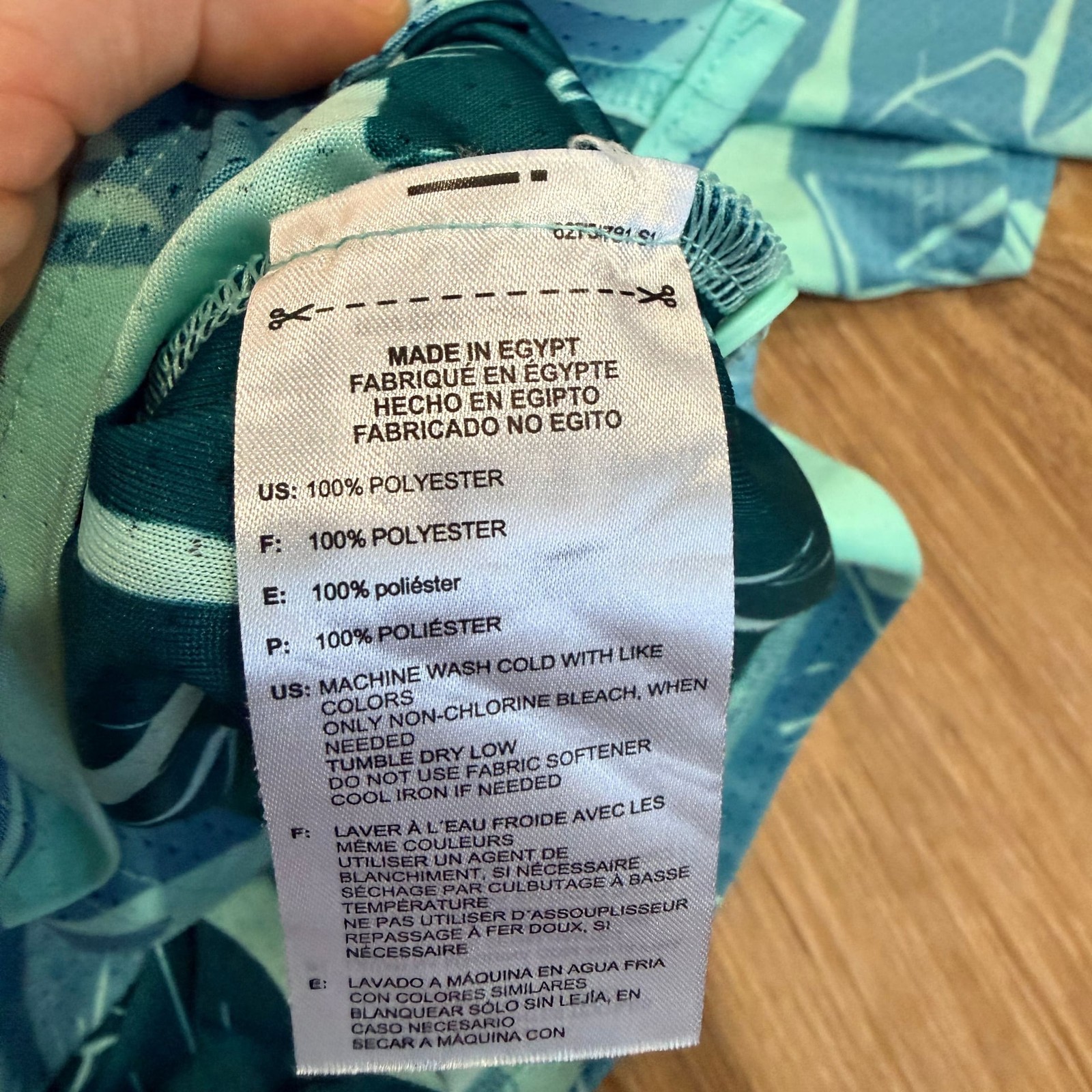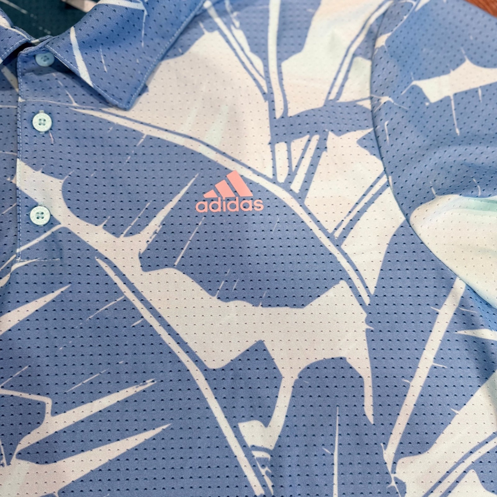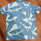 Adidas Golf Palm Leaf Mesh Polo Shirt, Lightweight Blue Floral, Men's Size XL. This performance polo features an all-over tropical palm leaf print in shades of blue and white. Designed with breathable mesh fabric, it is perfect for staying cool on the golf course or for casual summer wear. - Model: ADVR0842 - Material: 100% Polyester mesh for maximum ventilation. - Features: Two-button placket, classic collar, and Adidas logo on the chest. - Condition: New without tags (NWT condition based on appearance). - Fit: Lightweight and moisture-wicking.