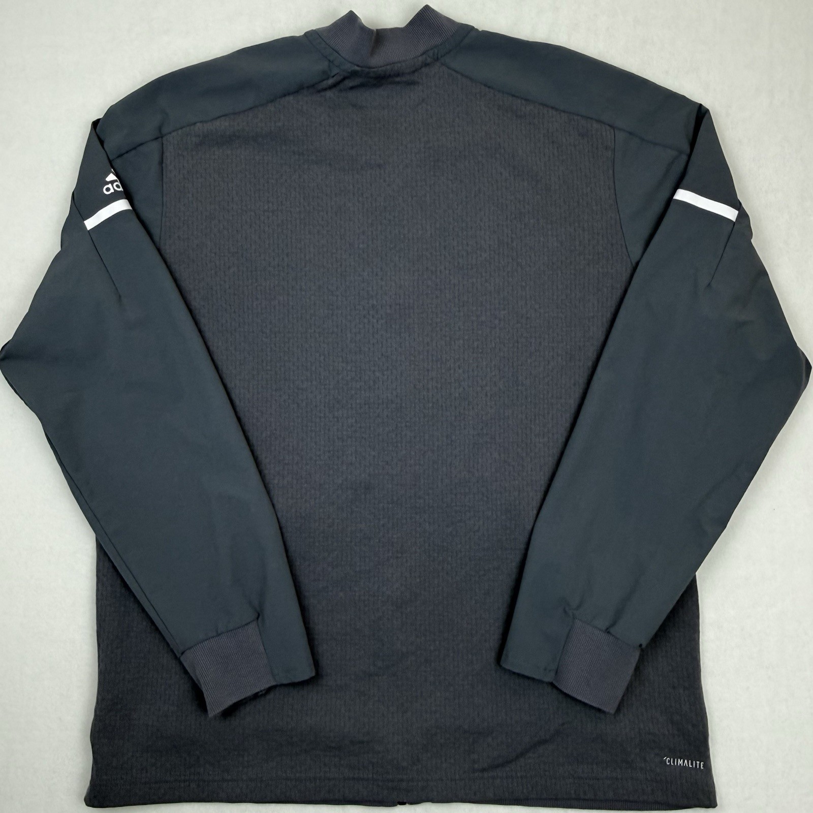 1200 Adidas Climalite Squad Bomber Track Jacket Men's XL Jacket, Full Zip with Pockets Reflective stripe on each Shoulder/arm Adidas hit on left shoulder/arm Jacket has a light lining This one is pre-owned. No stains or damage