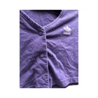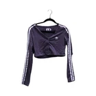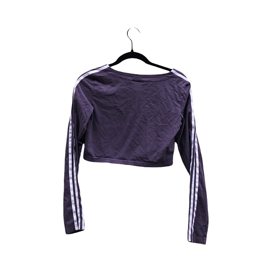 The product is a stylish Adidas long sleeve button-up top in a cropped style with classic stripes and a shadow violet color. It features a V-neckline and is designed for women in size M. The top is a perfect combination of sporty and trendy elements, making it a versatile piece for any wardrobe. Adidas is known for its quality and iconic brand, ensuring that this top is both fashionable and comfortable for everyday wear.